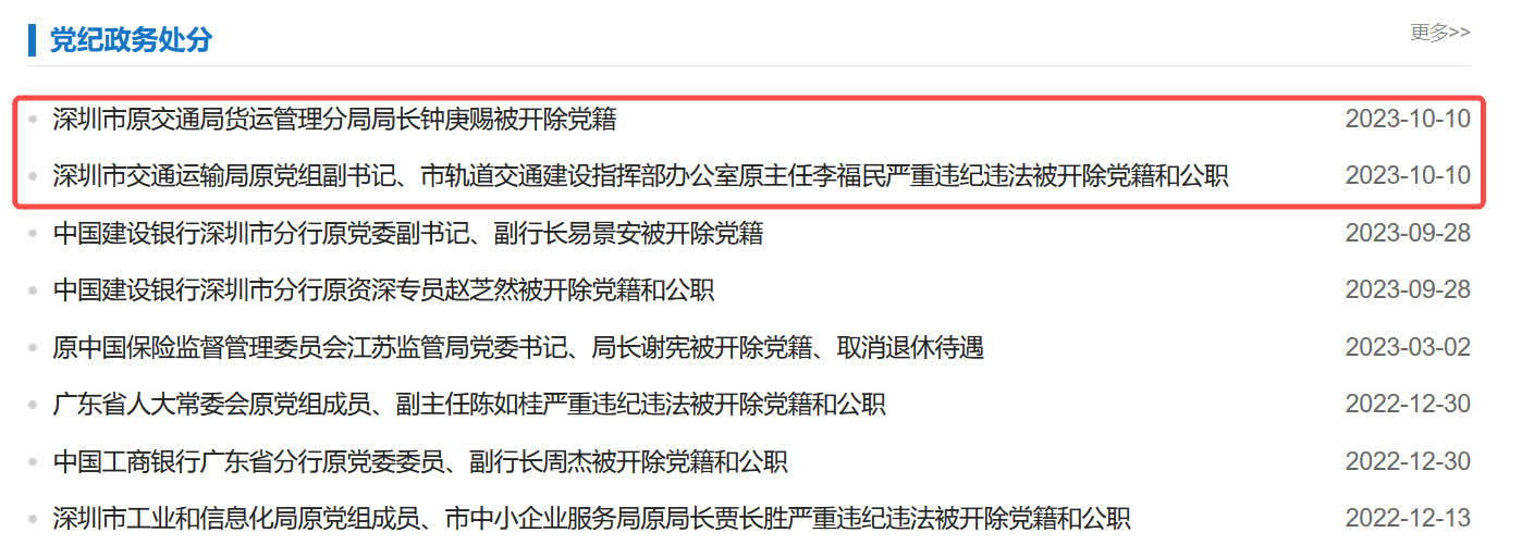 深圳市紀委監委網站10日通報,深圳市原交通局貨運管理分局局長鍾庚賜被開除黨籍,市交通運輸局原黨組副書記、市軌道交通建設指揮部辦公室原主任李福民嚴重違紀違法被開除黨籍和公職。