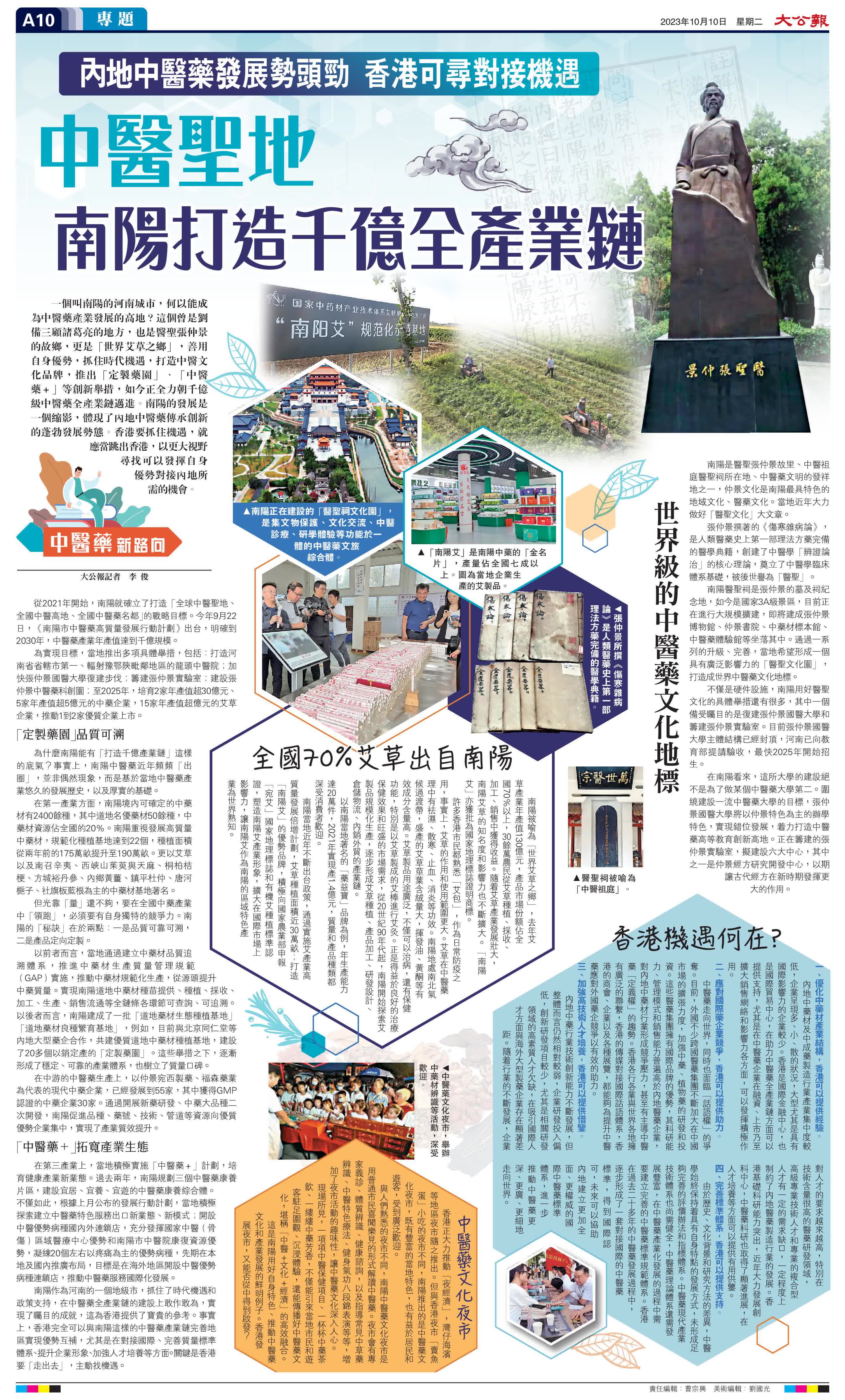 (大公報記者 李俊)一個叫南陽的河南城市,何以能成為中醫藥產業發展的高地?這個曾是劉備三顧諸葛亮的地方,也是醫聖張仲景的故鄉,更是「世界艾草之鄉」,善用自身優勢,抓住時代機遇,打造中醫文化品牌,推出「定製藥園」、「中醫藥+」等創新舉措,如今正全力朝千億級中醫藥全產業鏈邁進。南陽的發展是一個縮影,體現了內地中醫藥傳承創新的蓬勃發展勢態。香港要抓住機遇,就應當跳出香港,以更大視野尋找可以發揮自身優勢對接內地所需的機會。