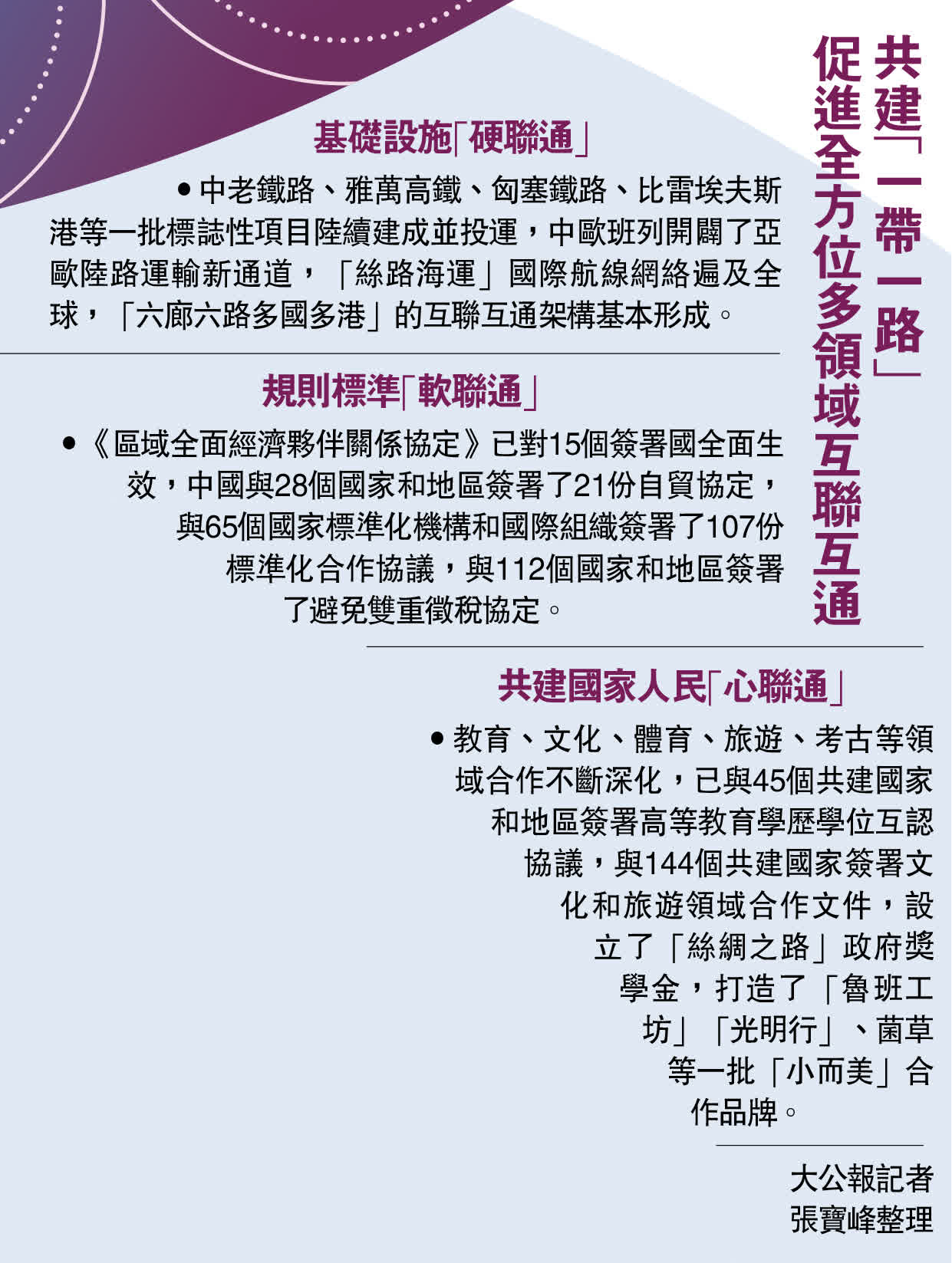 白皮書指出,共建「一帶一路」圍繞互聯互通,以基礎設施「硬聯通」為重要方向,以規則標準「軟聯通」為重要支撐,以共建國家人民「心聯通」為重要基礎,成為當今世界範圍最廣、規模最大的國際合作平台。