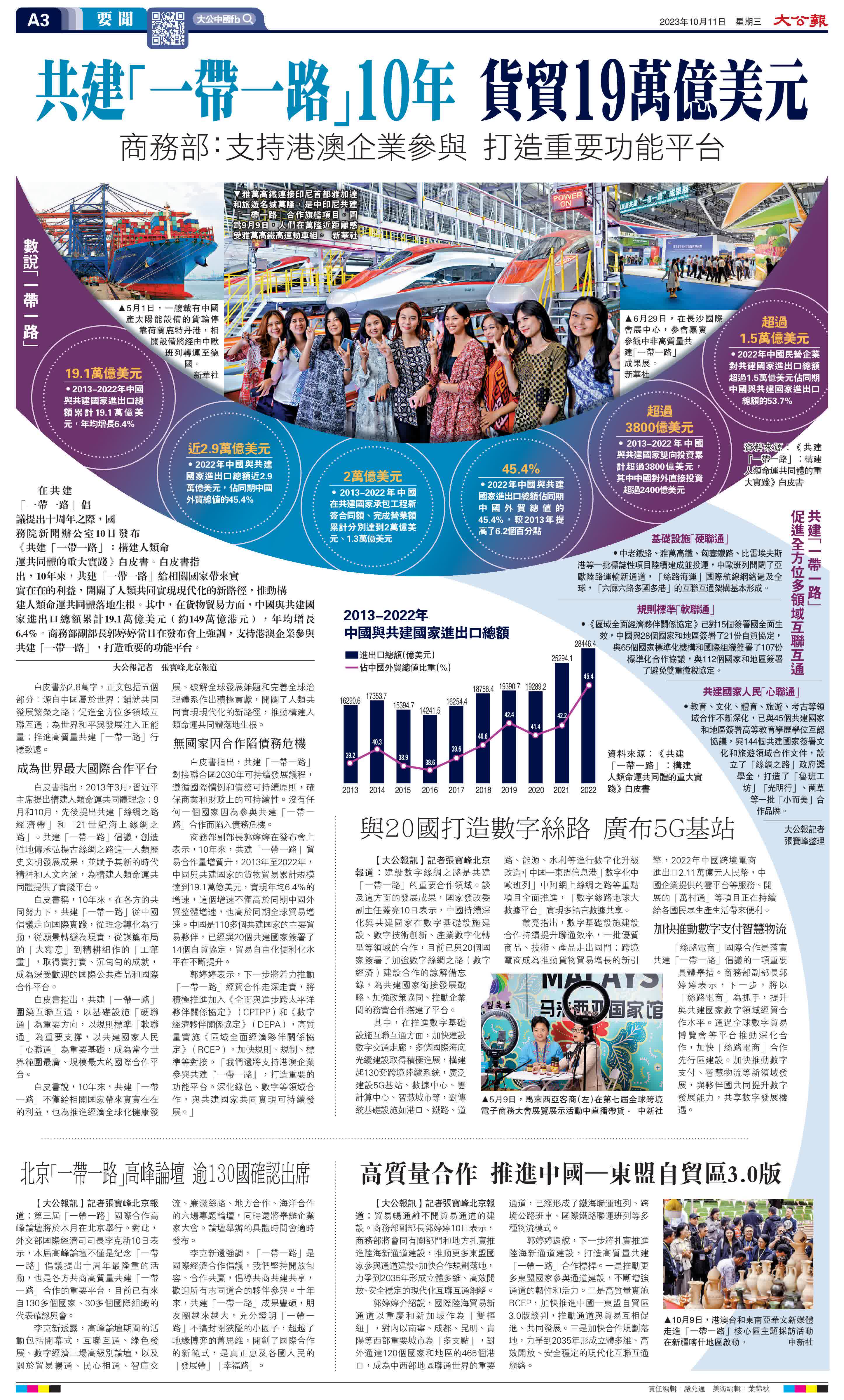 (大公報 記者 張寶峰)在共建「一帶一路」倡議提出十周年之際,國務院新聞辦公室10日發布《共建「一帶一路」:構建人類命運共同體的重大實踐》白皮書。白皮書指出,10年來,共建「一帶一路」給相關國家帶來實實在在的利益,開闢了人類共同實現現代化的新路徑,推動構建人類命運共同體落地生根。其中,在貨物貿易方面,中國與共建國家進出口總額累計19.1萬億美元(約149萬億港元),年均增長6.4%。商務部副部長郭婷婷當日在發布會上強調,支持港澳企業參與共建「一帶一路」,打造重要的功能平台。