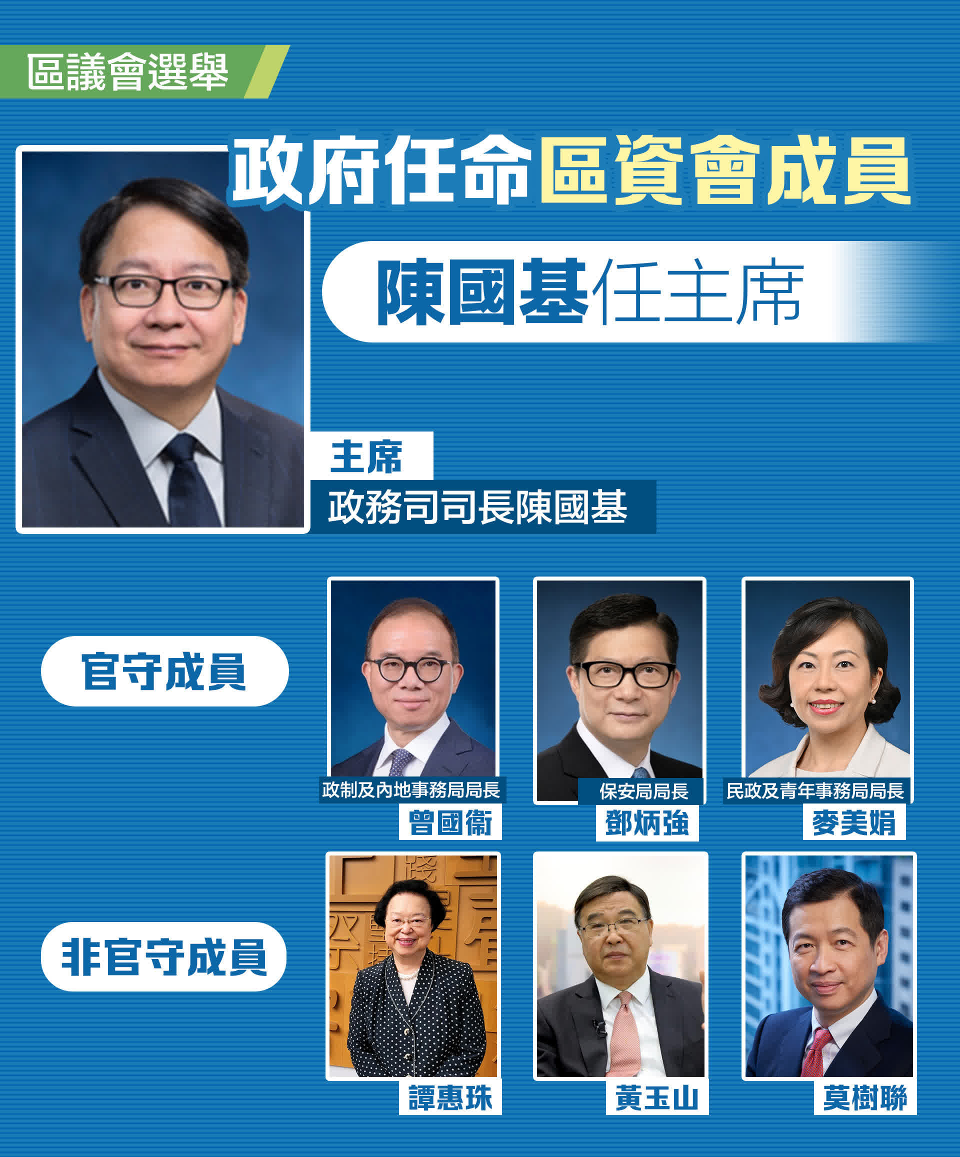 區資會成員包括主席政務司司長陳國基,官守成員政制及內地事務局局長曾國衞、保安局局長鄧炳強及民政及青年事務局局長麥美娟,以及非官守成員譚惠珠、黃玉山及莫樹聯。有關任命已於今日在憲報刊登,並已報中央人民政府備案。
