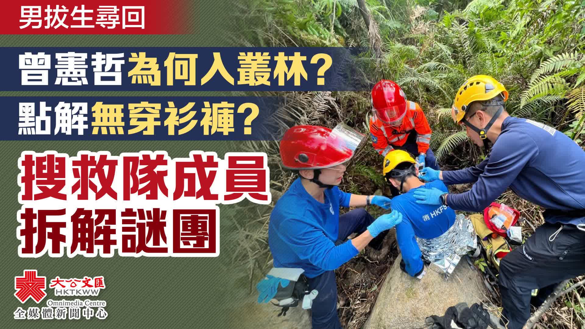 據悉,曾憲哲當時清醒但神智呆滯,搜救人員問他為何會自己上山及不下山求助,當時曾沒有回應;人員再問他為何會在水澗附近逗留,曾回應「因為這裏有水飲」;人員問及為何沒有穿衫褲,曾回答「因為好凍」。
