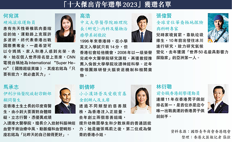 今屆傑青昨日公布得獎名單,得獎者包括香港硬地滾球運動員何宛淇、中文大學醫學院助理院長(研究)兼內科及藥物治療學系副教授高浩、華裔極地探險與科研專家張偉賢、伊利沙伯醫院放射診斷部顧問醫生馬承志、2009年香港小姐冠軍劉倩婷,以及前全職香港劍擊運動員林衍聰。