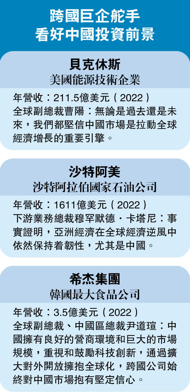 顧學明說,全球經濟增長不確定性增強,中國經濟依然保持穩定發展。聯合國貿發會議預測,全球經濟增速將從2022年的3.1%下降至2023年的2.3%,國際貨幣基金組織預測,全球經濟增速將從2022年的3.5%下降至2023年的3.0%。但國際組織紛紛上調對中國經濟增長的預期,預測中國經濟增長在5%以上,顯著高於全球主要經濟體。在全球經濟不確定性增強的情況下,中國經濟增長前景展現出更強的確定性,為跨國公司投資中國提供了更加廣闊的空間。