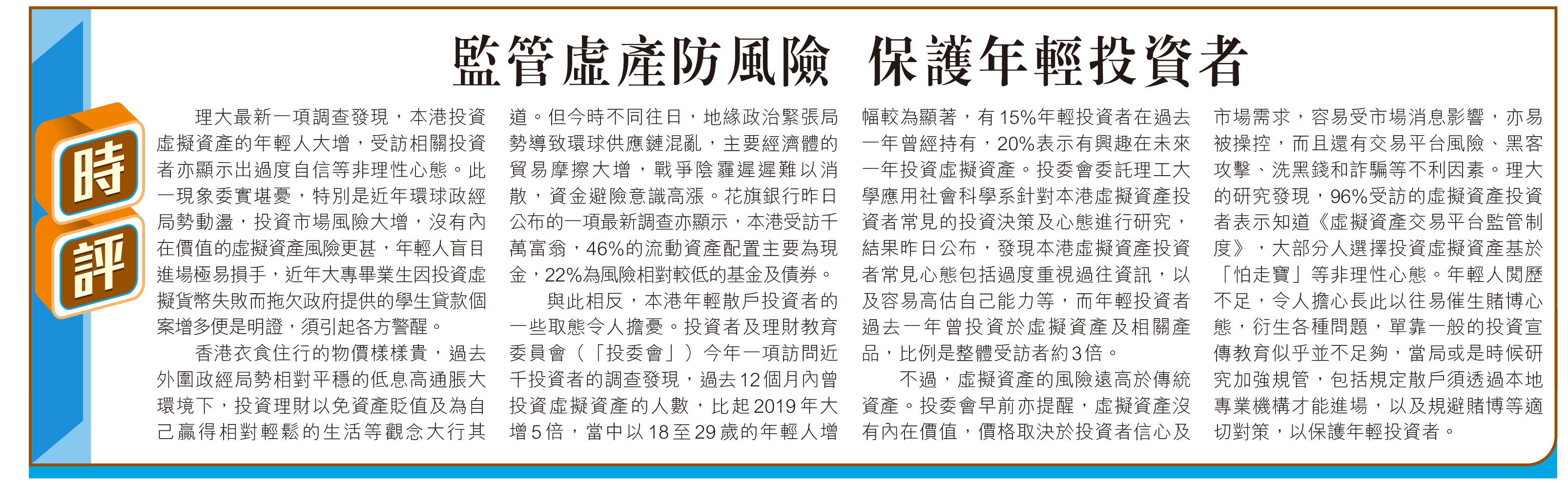 理大最新一項調查發現,本港投資虛擬資產的年輕人大增,受訪相關投資者亦顯示出過度自信等非理性心態。此一現象委實堪憂,特別是近年環球政經局勢動盪,投資市場風險大增,沒有內在價值的虛擬資產風險更甚,年輕人盲目進場極易損手,近年大專畢業生因投資虛擬貨幣失敗而拖欠政府提供的學生貸款個案增多便是明證,須引起各方警醒。