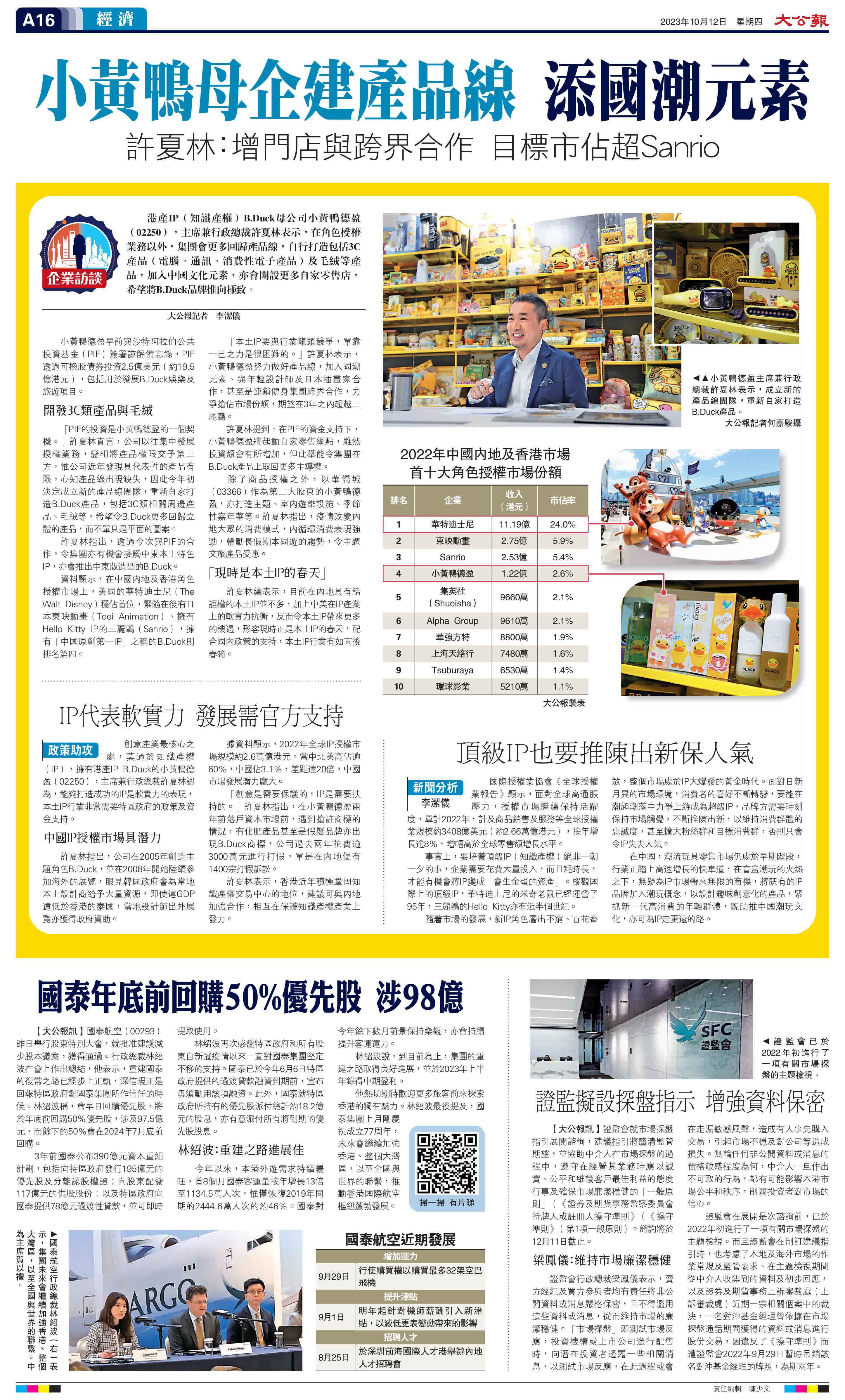 (大公報 記者 李潔儀)港產IP(知識產權)B.Duck母公司小黃鴨德盈(02250),主席兼行政總裁許夏林表示,在角色授權業務以外,集團會更多回歸產品線,自行打造包括3C產品(電腦、通訊、消費性電子產品)及毛絨等產品,加入中國文化元素,亦會開設更多自家零售店,希望將B.Duck品牌推向極致。