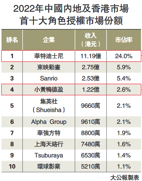 資料顯示,在中國內地及香港角色授權市場上,美國的華特迪士尼(The Walt Disney)穩佔首位,緊隨在後有日本東映動畫(Toei Animation)、擁有Hello Kitty IP的三麗鷗(Sanrio),擁有「中國原創第一IP」之稱的B.Duck則排名第四。