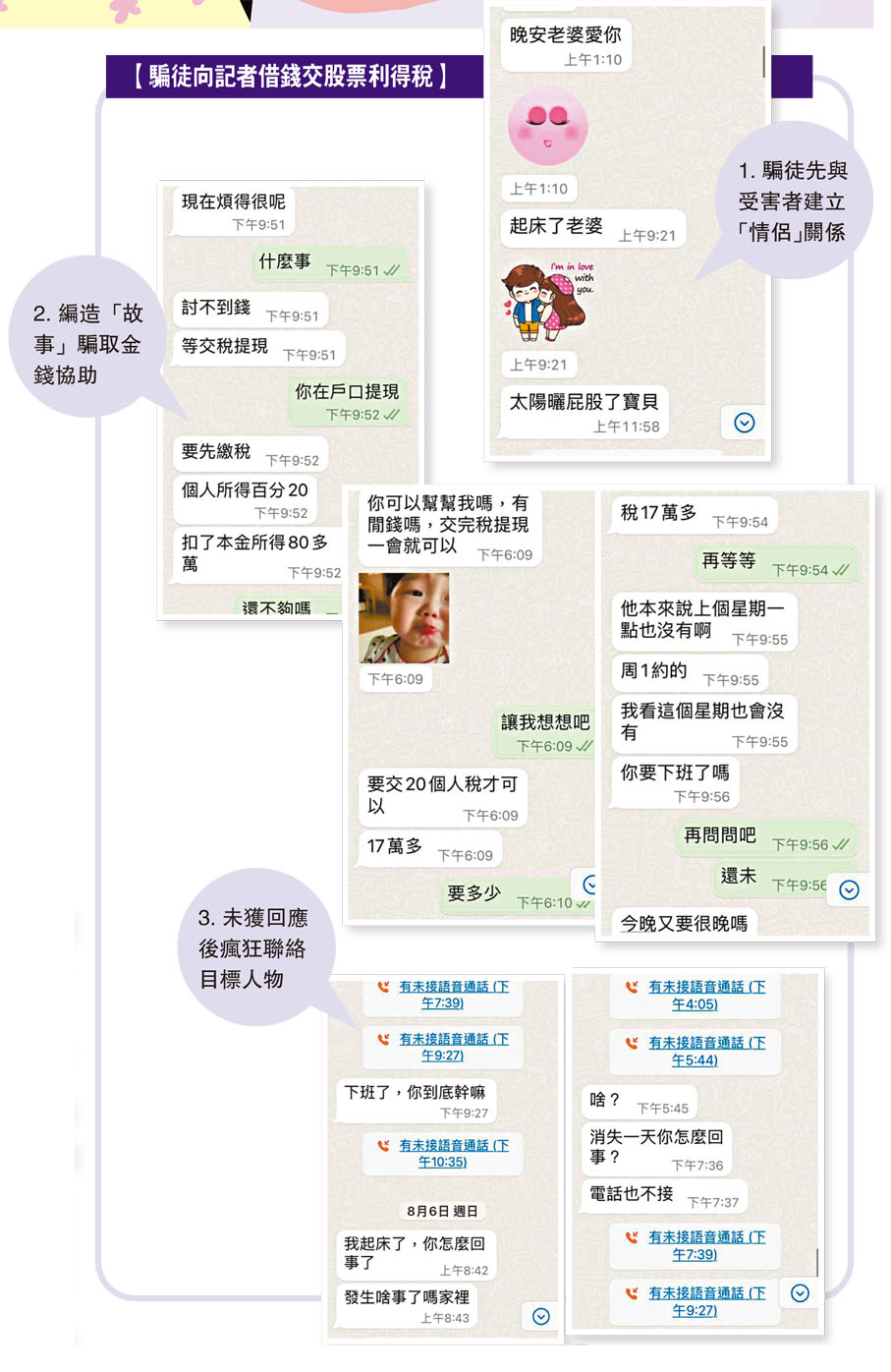 香港文匯報記者用「白富美」人設親歷了「殺豬盤」的傷害有多深,經過兩個月與「男朋友」甜蜜戀愛,收穫的是一個「消失的他」,假如記者不是實測,相信受害者必定情傷身瘦,損失十多萬元金錢。記者先在交友App找來一位自稱在港從事網絡維護的保安專家作為目標,經過一個多星期便確定了「戀人」關係,之後的個多月時間裏,騙徒絕口不提任何投資,只與「女朋友」分享過去和未來的故事,希望多賺點錢在港與「女朋友」成家共建未來及了解「女朋友」的家庭背景、工作及日常生活等等。