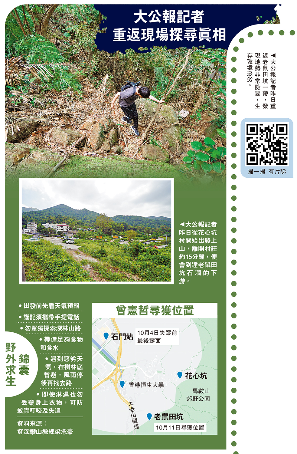 失蹤少年奇跡般尋獲引發全城熱話,尋獲少年地點的老鼠田坑位處何地?該處環境如何?是否具備野外生存的條件……《大公報》記者昨日實地走訪尋獲曾憲哲的老鼠田坑荒林,尋找少年荒野求生的蛛絲馬跡。不過,有攀山專家直言,在無裝備且遇上極端天氣情況下,在荒野生存八日是「絕對無可能」,一般人在沒有任何食水和食物情況下,要在荒山求生,一般兩至三日已經是極限,不排除事有蹺蹊,並提醒市民切勿單獨探索深林野路。