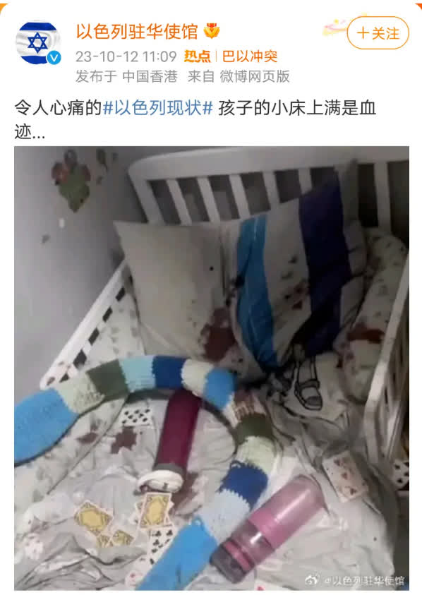 以色列駐華使館的貼文是:令人心痛的以色列現狀,孩子的小床上滿是血跡……