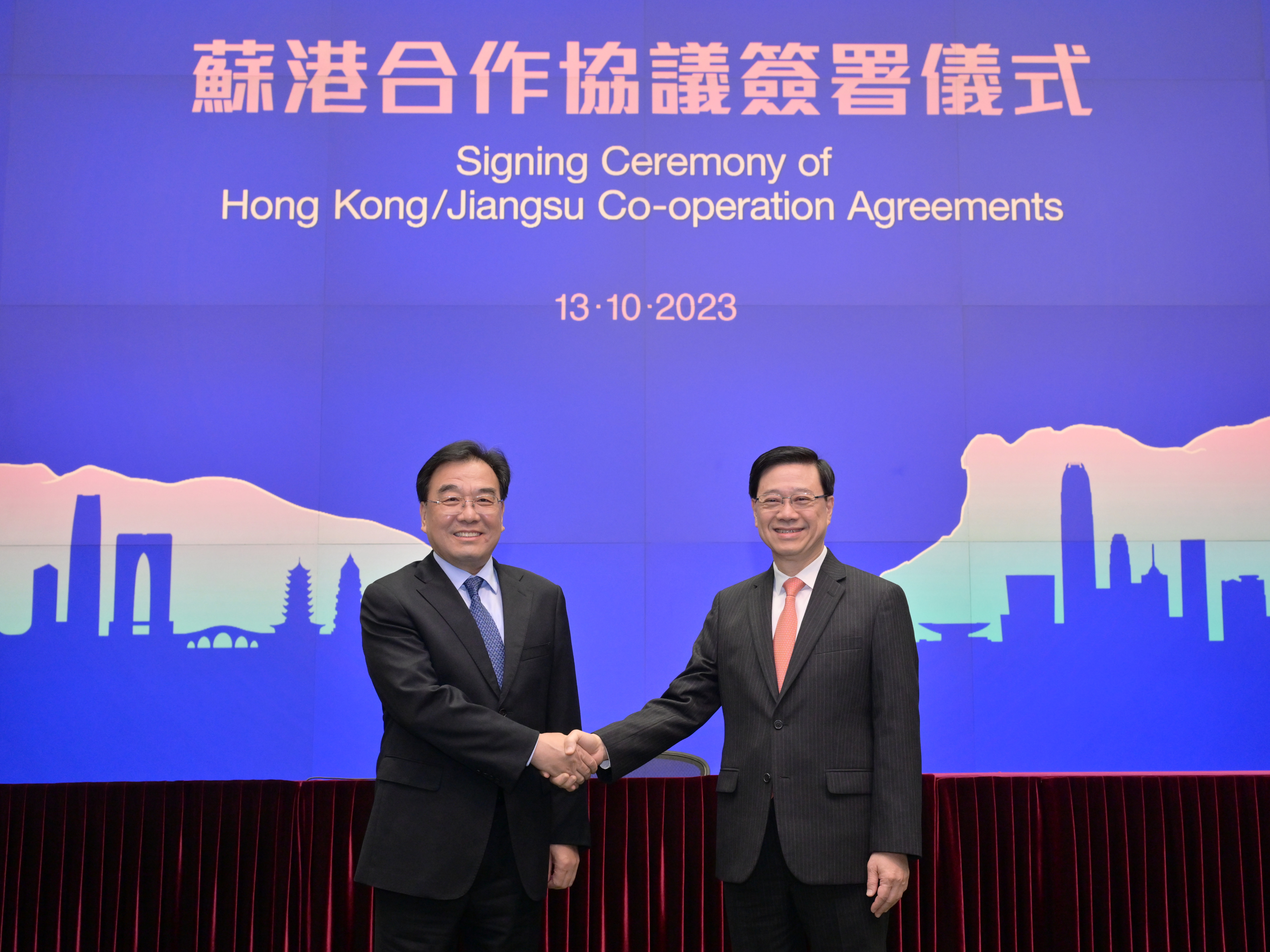 大公文匯全媒體報道,行政長官李家超率領香港特別行政區政府代表團與江蘇省委書記信長星率領的江蘇省政府代表團今日(13日)在香港舉行蘇港高層會晤暨蘇港合作協議簽署儀式,共同見證香港和江蘇兩地簽署多項合作協議,推進深化雙方的共同發展,強化優勢互補,實現互利共贏。