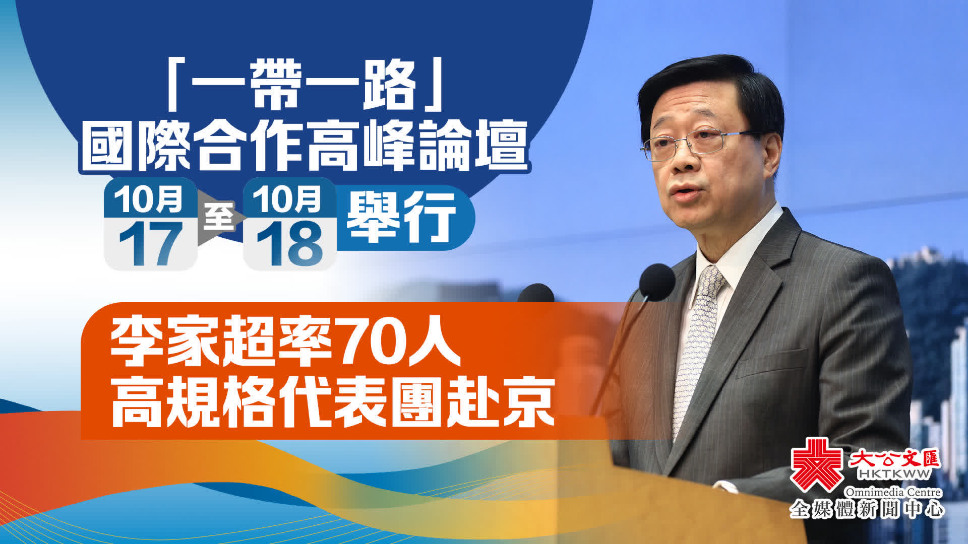 第三屆「一帶一路」國際合作高峰論壇將於10月17日至18日(下周二至周三)在北京舉行,香港特區行政長官李家超16日將率領高規格的70人香港特區代表團參與高峰論壇。成員除了司局長等高層官員,還包括重量級政商界人士和不同界別的專家學者等。