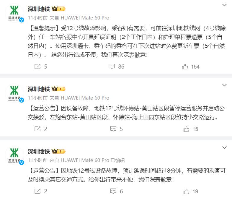 深圳地鐵昨晚發布3條運營公告,稱地鐵12號線出現設備故障,暫停服務並啟動公交接駁。乘客如有需要,可前往深圳地鐵線網(4號線除外)任一車站客服中心開具延誤證明(2個工作日內)和辦理單程票退票(5個自然日內)。使用深圳通卡、乘車碼的乘客可在下次進站時免費更新車票(5個自然日內)。