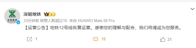 今晨(14日),深圳地鐵發文表示,地鐵12號線已恢復運營。
