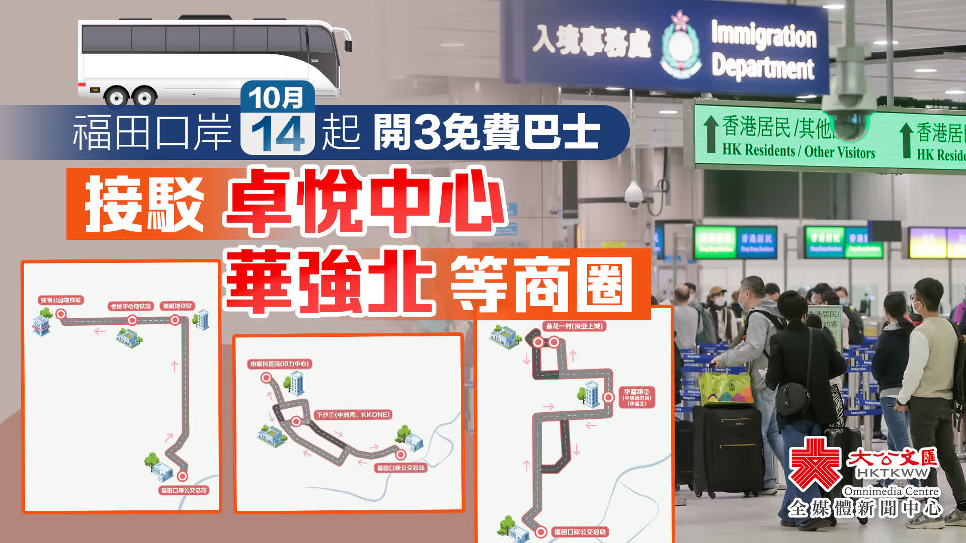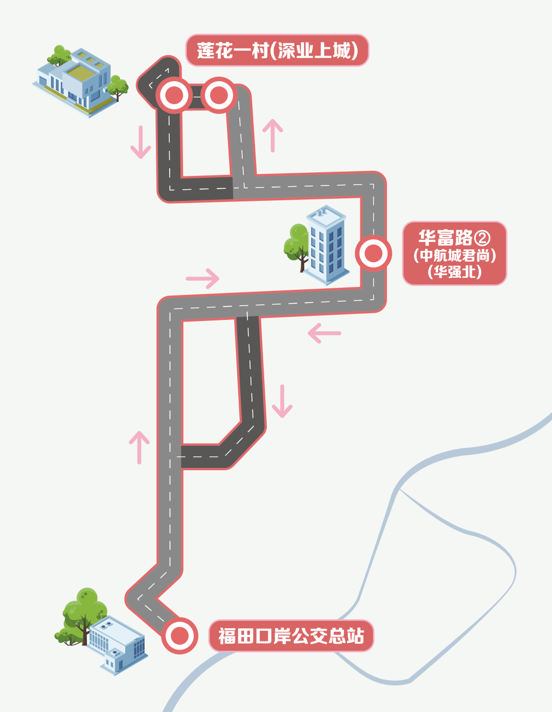 福田口岸始發,覆蓋華強北(中航城君尚)、深業上城等核心商圈。