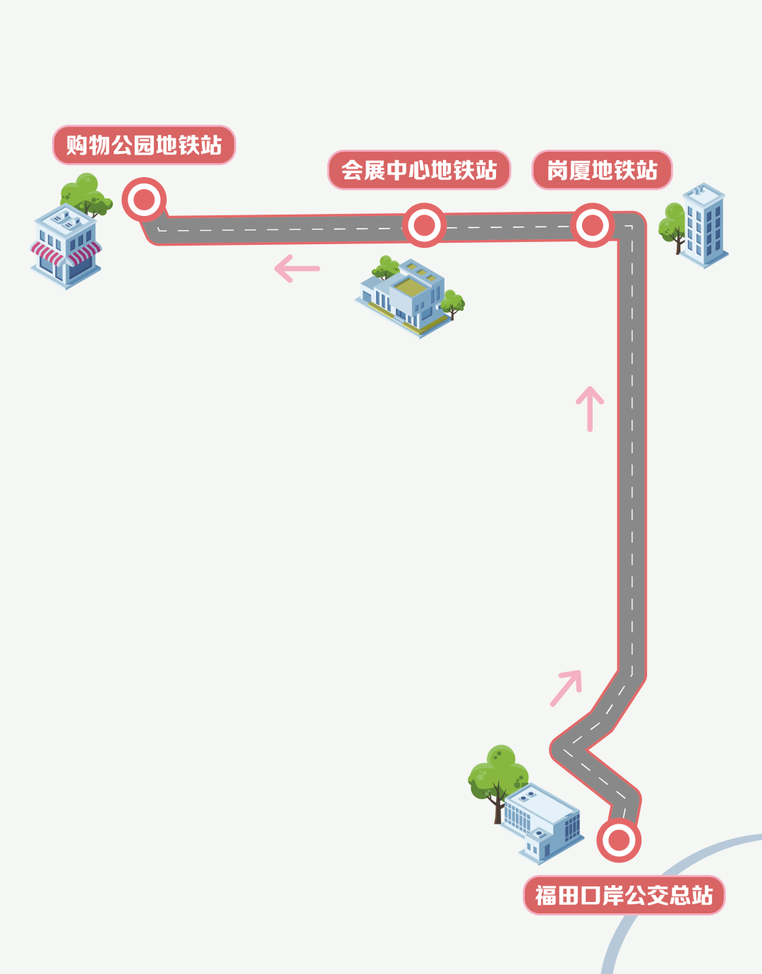停靠站點:福田口岸公交總站、崗廈地鐵站、會展中心地鐵站、購物公園地鐵站