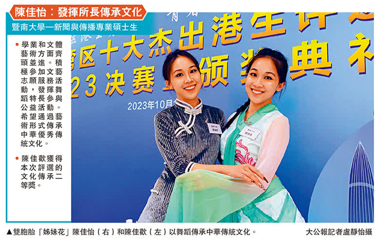 比賽現場,一對雙胞胎姊妹的身影分外醒目。她們是來自暨南大學的香港學生陳佳怡和陳佳歡。陳佳怡在校擔任舞蹈團團長,還考取了中國舞教學證書,給中小學的比賽節目編排舞蹈節目。陳佳歡更是從大學藝術團走上講台,成為暨南大學附屬中學舞蹈老師,負責學生節目編排和教學,以舞蹈形式傳承藝術精神。「我們都希望通過藝術形式傳承中華優秀傳統文化。」