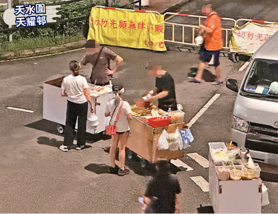 除了尚德邨,天水圍天耀邨也是「走鬼檔」勝地,每晚九時後,邨內巴士總站外的路旁便有多檔熟食小販雲集,日前夜晚大公報記者看見有五檔小販擺賣,多檔同樣配備石油爐及石油氣罐,即場烹煮炒麵、魚蛋及車仔麵等,吸引大批街坊購買。上址已是聞名的小販聚集地,房屋署雖在附近擺放「切勿光顧無牌小販」告示,惟食客照光顧,小販在告示牌前照擺賣,屋邨保安人員巡經亦視若無睹。