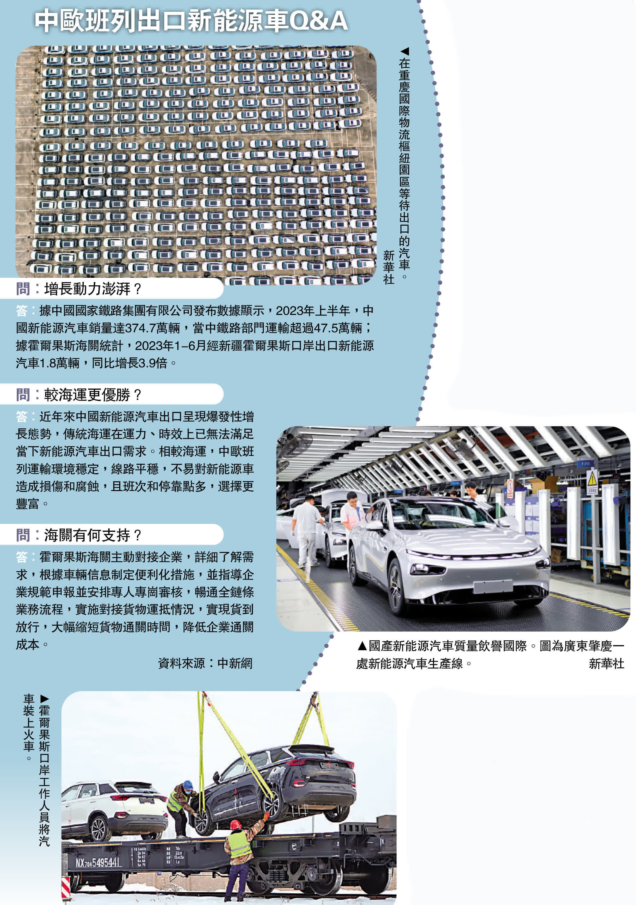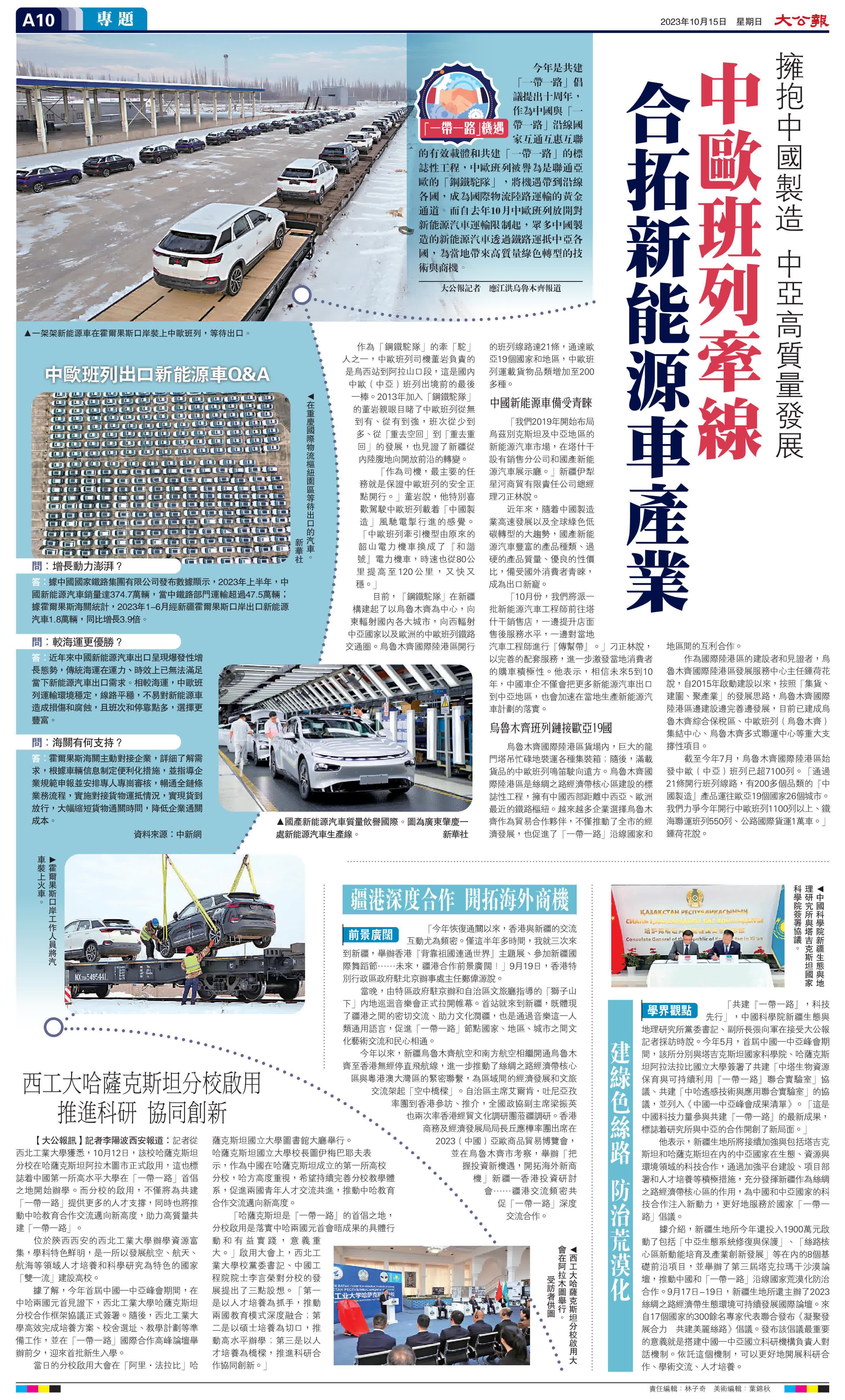 (大公報 記者 應江洪 烏魯木齊報道)今年是共建「一帶一路」倡議提出十周年,作為中國與「一帶一路」沿線國家互通互惠互聯的有效載體和共建「一帶一路」的標誌性工程,中歐班列被譽為是聯通亞歐的「鋼鐵駝隊」,將機遇帶到沿線各國,成為國際物流陸路運輸的黃金通道。而自去年10月中歐班列放開對新能源汽車運輸限制起,眾多中國製造的新能源汽車透過鐵路運抵中亞各國,為當地帶來高質量綠色轉型的技術與商機。