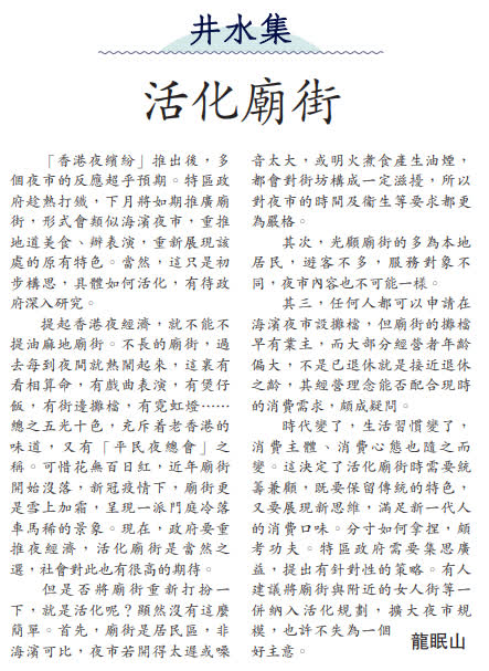 時代變了,生活習慣變了,消費主體、消費心態也隨之而變。這決定了活化廟街時需要統籌兼顧,既要保留傳統的特色,又要展現新思維,滿足新一代人的消費口味。分寸如何拿捏,頗考功夫。特區政府需要集思廣益,提出有針對性的策略。有人建議將廟街與附近的女人街等一併納入活化規劃,擴大夜市規模,也許不失為一個好主意。