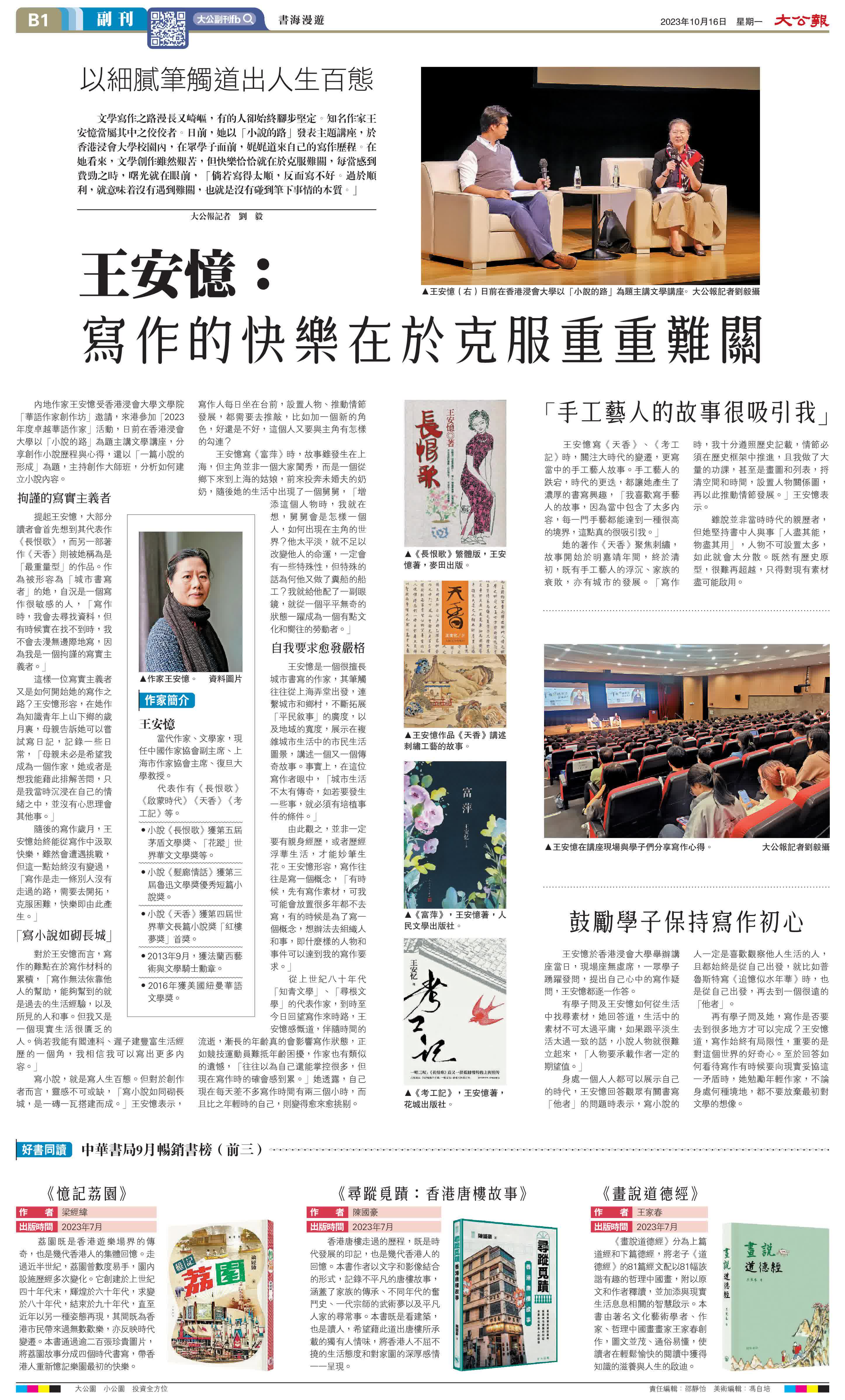 內地作家王安憶受香港浸會大學文學院「華語作家創作坊」邀請,來港參加「2023年度卓越華語作家」活動,日前在香港浸會大學以「小說的路」為題主講文學講座,分享創作小說歷程與心得,還以「一篇小說的形成」為題,主持創作大師班,分析如何建立小說內容。