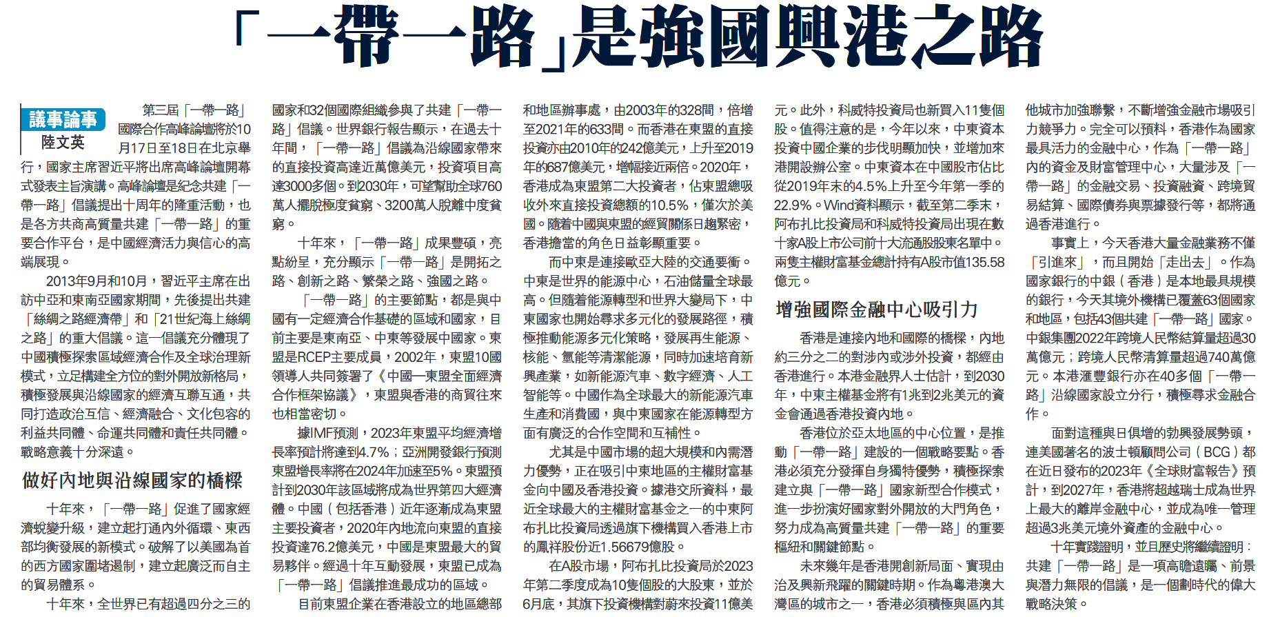事實上,今天香港大量金融業務不僅「引進來」,而且開始「走出去」。作為國家銀行的中銀(香港)是本地最具規模的銀行,今天其境外機構已覆蓋63個國家和地區,包括43個共建「一帶一路」國家。中銀集團2022年跨境人民幣結算量超過30萬億元;跨境人民幣清算量超過740萬億元。本港滙豐銀行亦在40多個「一帶一路」沿線國家設立分行,積極尋求金融合作。