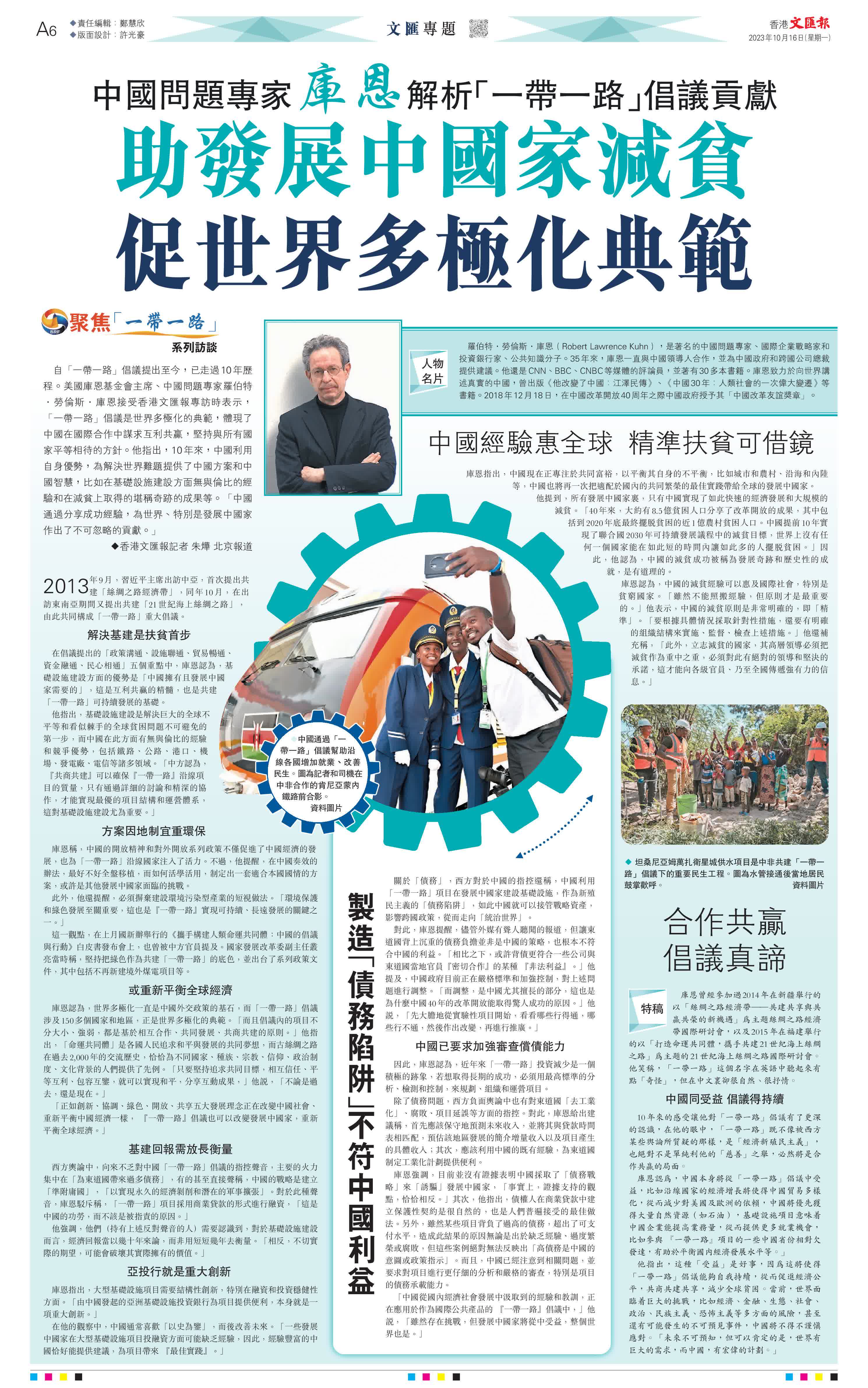 (香港文匯報 記者 朱燁 北京報道)自「一帶一路」倡議提出至今,已走過10年歷程。美國庫恩基金會主席、中國問題專家羅伯特·勞倫斯·庫恩接受香港文匯報專訪時表示,「一帶一路」倡議是世界多極化的典範,體現了中國在國際合作中謀求互利共贏,堅持與所有國家平等相待的方針。他指出,10年來,中國利用自身優勢,為解決世界難題提供了中國方案和中國智慧,比如在基礎設施建設方面無與倫比的經驗和在減貧上取得的堪稱奇跡的成果等。「中國通過分享成功經驗,為世界、特別是發展中國家作出了不可忽略的貢獻。」