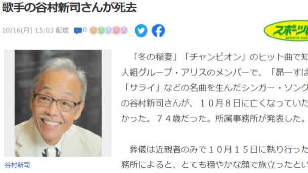 據中新網綜合報道,日本著名歌手谷村新司已於10月8日去世,終年74歲,其所屬事務所16日發布了這一消息。