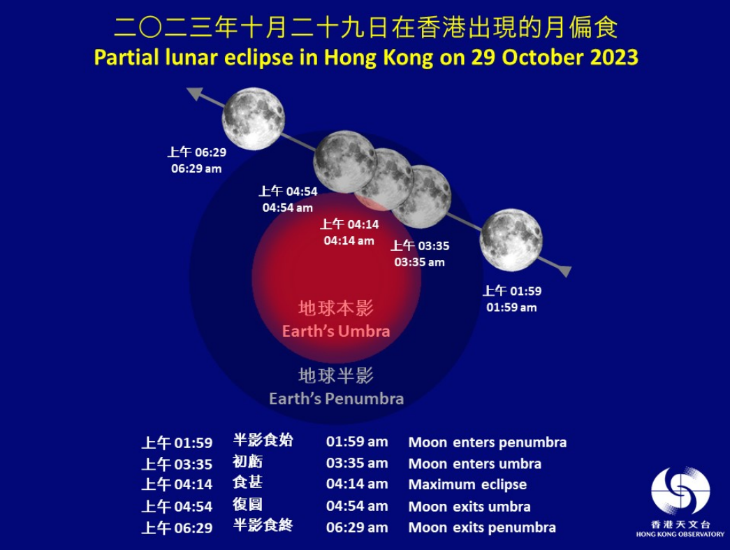 大公文匯全媒體報道,天文台預告,香港上空10月29日(星期日)凌晨將出現月偏食。這次月食期間月亮的仰角較低,若天氣情況許可,市民可以肉眼直接觀賞月食過程,面向西方而沒有障礙物的地點都適合觀賞月食。