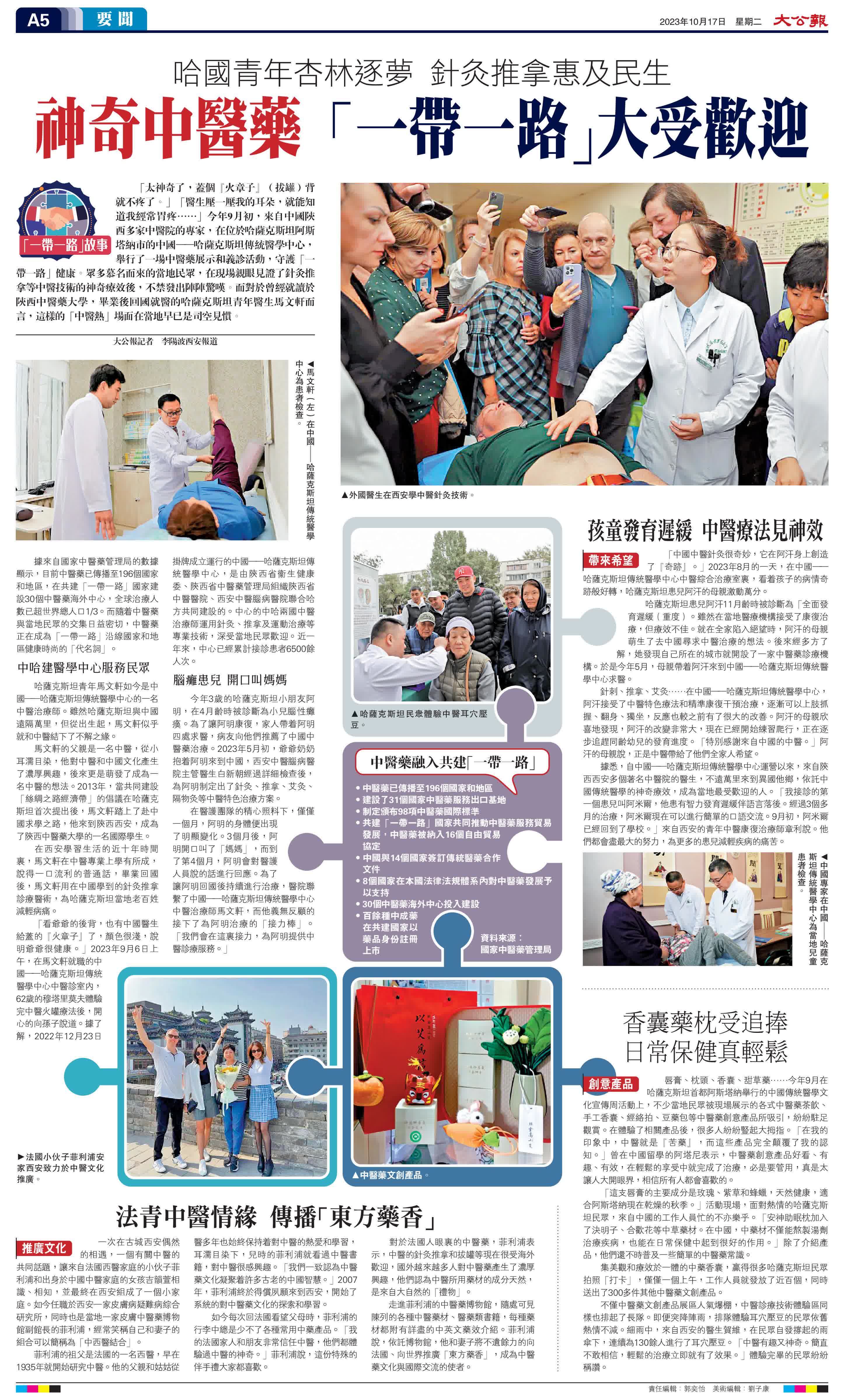 (大公報 記者 李陽波 西安報道)「太神奇了,蓋個『火章子』(拔罐)背就不疼了。」「醫生壓一壓我的耳朵,就能知道我經常胃疼……」今年9月初,來自中國陝西多家中醫院的專家,在位於哈薩克斯坦阿斯塔納市的中國──哈薩克斯坦傳統醫學中心,舉行了一場中醫藥展示和義診活動,守護「一帶一路」健康。眾多慕名而來的當地民眾,在現場親眼見證了針灸推拿等中醫技術的神奇療效後,不禁發出陣陣驚嘆。而對於曾經就讀於陝西中醫藥大學,畢業後回國就醫的哈薩克斯坦青年醫生馬文軒而言,這樣的「中醫熱」場面在當地早已是司空見慣。