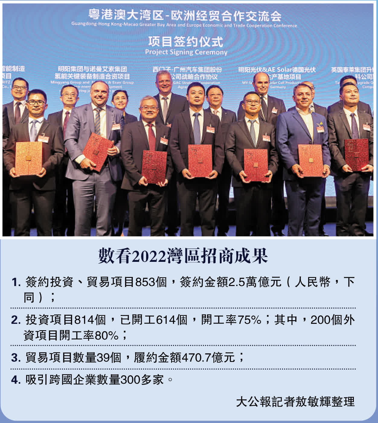 記者從發布會上獲悉,去年12月21日至22日舉行的首屆粵港澳大灣區全球招商大會,吸引300多家跨國企業參會,達成合作項目853個、投資總額2.5萬億元人民幣,取得了豐碩成果。廣東省商務廳廳長張勁松介紹,三地政府共同決定,今年起,粵港澳大灣區全球招商大會將每年定期舉辦,並固定在11月8日開幕。2023粵港澳大灣區全球招商大會將宣介橫琴、前海、南沙、河套等重大合作平台的開放創新舉措和重大政策利好,全面展現大灣區的雄厚實力和發展潛力,與全球投資者共享粵港澳大灣區投資機遇和發展紅利。