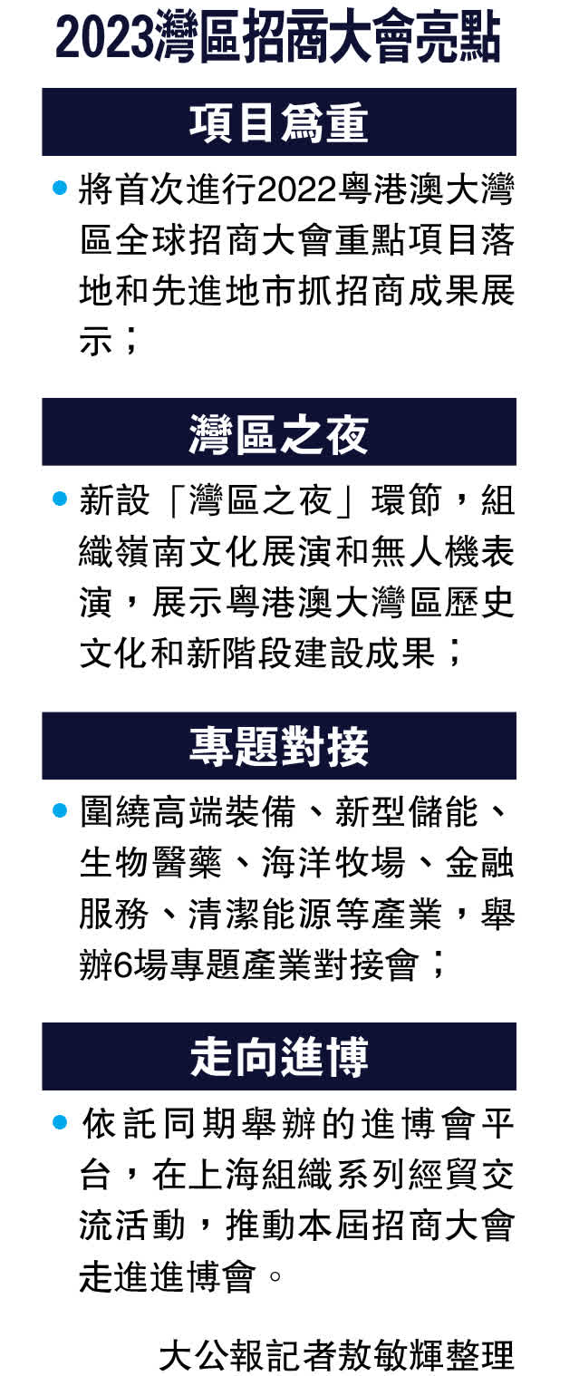 (大公報 記者 敖敏輝 廣州報道)記者從16日舉行的廣東省政府新聞辦發布會上獲悉,從今年起,粵港澳大灣區全球招商大會將每年定期舉辦,今年招商大會則將於11月8日至9日舉行,屆時會安排「1+9+N」系列活動,並新設「灣區之夜」環節。根據安排,今屆大會將依託大灣區產業融合集聚搭平台,開展以商招商、以鏈招商、聯合招商,簽約項目重點聚焦高新技術項目、總部型項目和外資研發中心,力爭達成一批高質量合作項目,目前世界500強等跨國公司已踴躍報名參會。