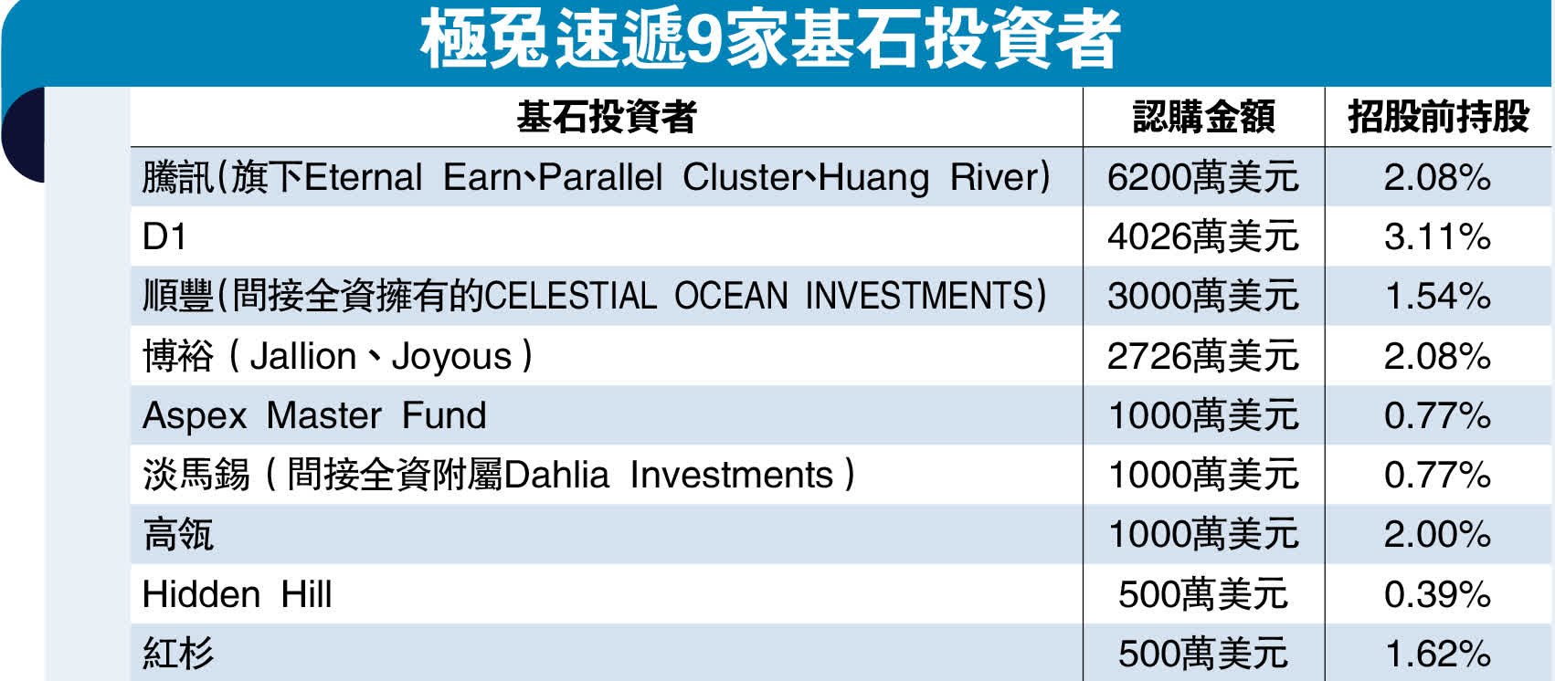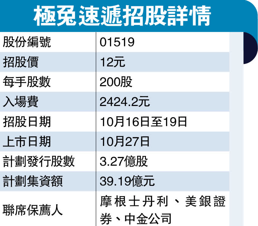 (大公報 記者 許臨)東南亞最大快遞物流企業極兔速遞(01519)昨天起招股,計劃發行3.27億股,集資39.19億元,一成在香港公開發售,招股價12元,每手200股,入場費2424.2元。首日各券商共錄得孖展額1.2億元,相當於公開發售部分37%。該公司引入9名基石投資者,包括騰訊控股(00700)、順豐、淡馬錫和高瓴等,共認購近2億美元(約15.6億港元),佔近四成集資額,惟專家指近日氣氛偏淡,對新股的表現不感樂觀,看好的投資者應待上市後吸納。