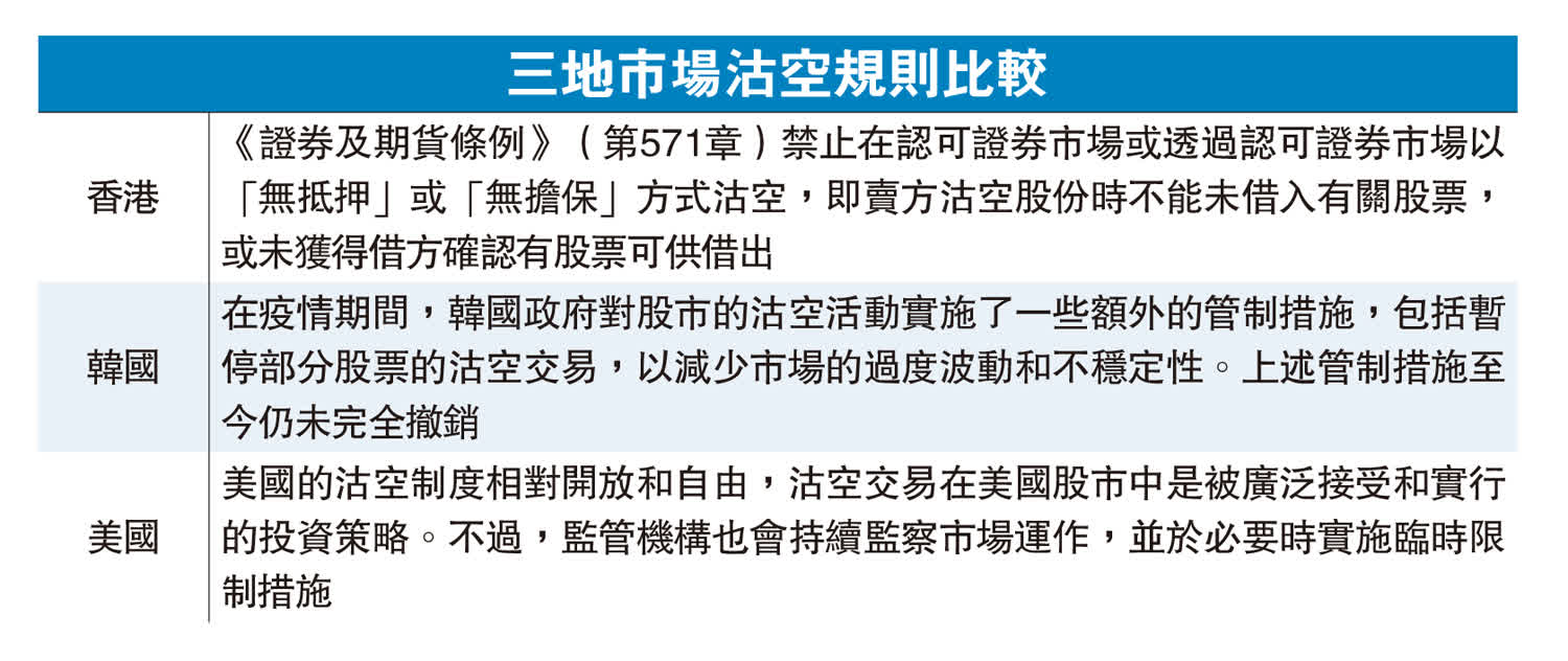 另方面,香港證監會早於2012年6月推出淡倉申報制度。在該制度下,任何人持有須申報的淡倉必須每周向證監會申報,證監會亦會公布合計的淡倉量數據。