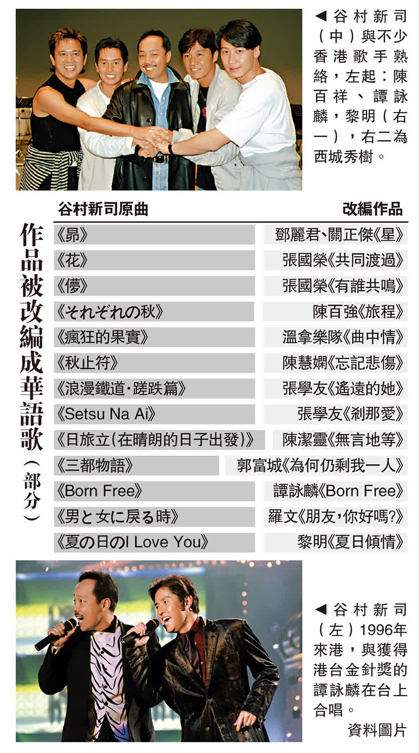 谷村新司與香港樂壇關係密切,譚詠麟、張學友、梅艷芳、張國榮、郭富城及黎明等曾改編他的作品。得知谷村新司逝世的消息,譚詠麟在社交平台上寫道:「日本著名歌手兼我好友谷村新司離開我們了!懷念。」