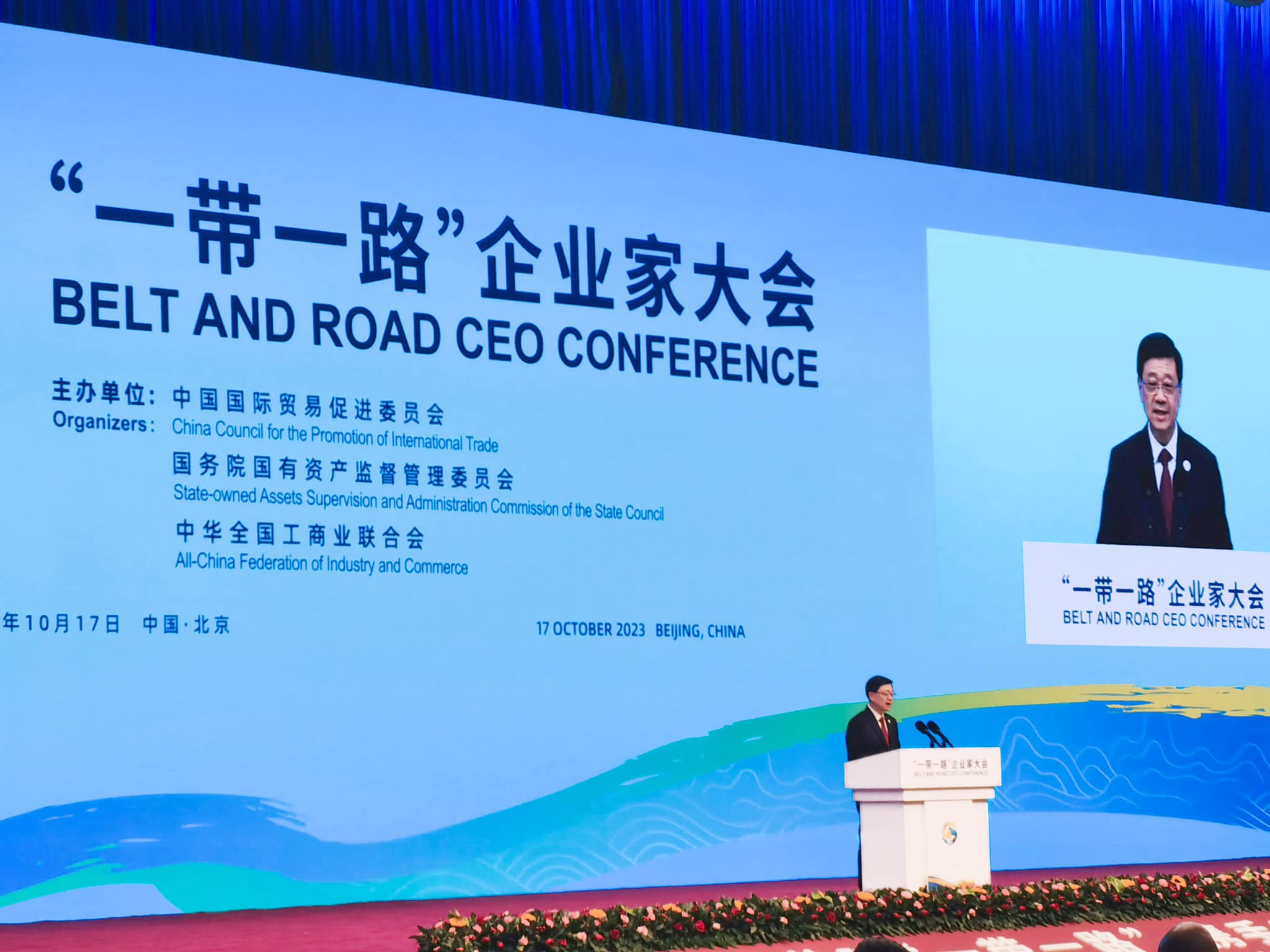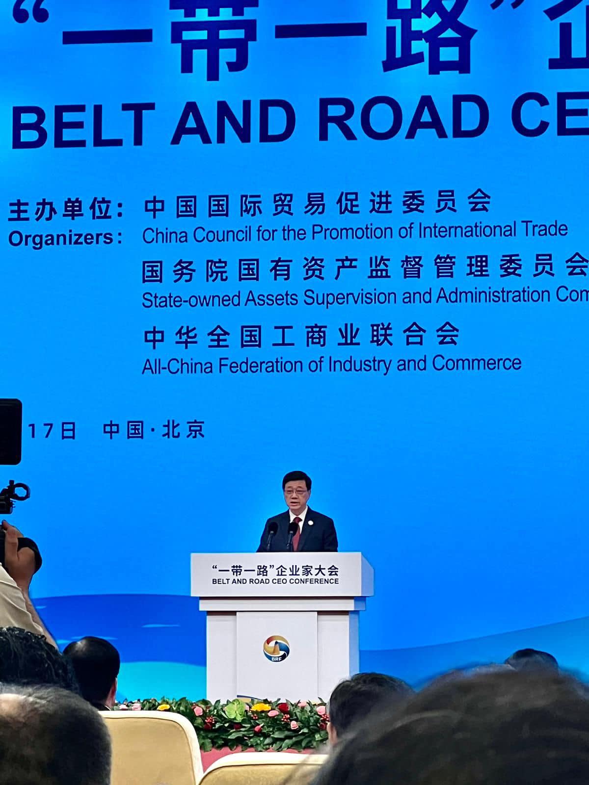 大公文匯全媒體報道,第三屆「一帶一路」國際合作高峰論壇今明兩日(17至18日)在北京舉行,香港特區行政長官李家超率領高規格的70人代表團赴京參與論壇。李家超今日下午在論壇的首場活動「一帶一路」企業家大會上致辭,他表示,誠意邀請各位企業家來香港建立「一帶一路辦公室」,攜手開拓機遇,推動更多高標準、可持續、惠民生的高質量發展項目,共同發展繁榮。
