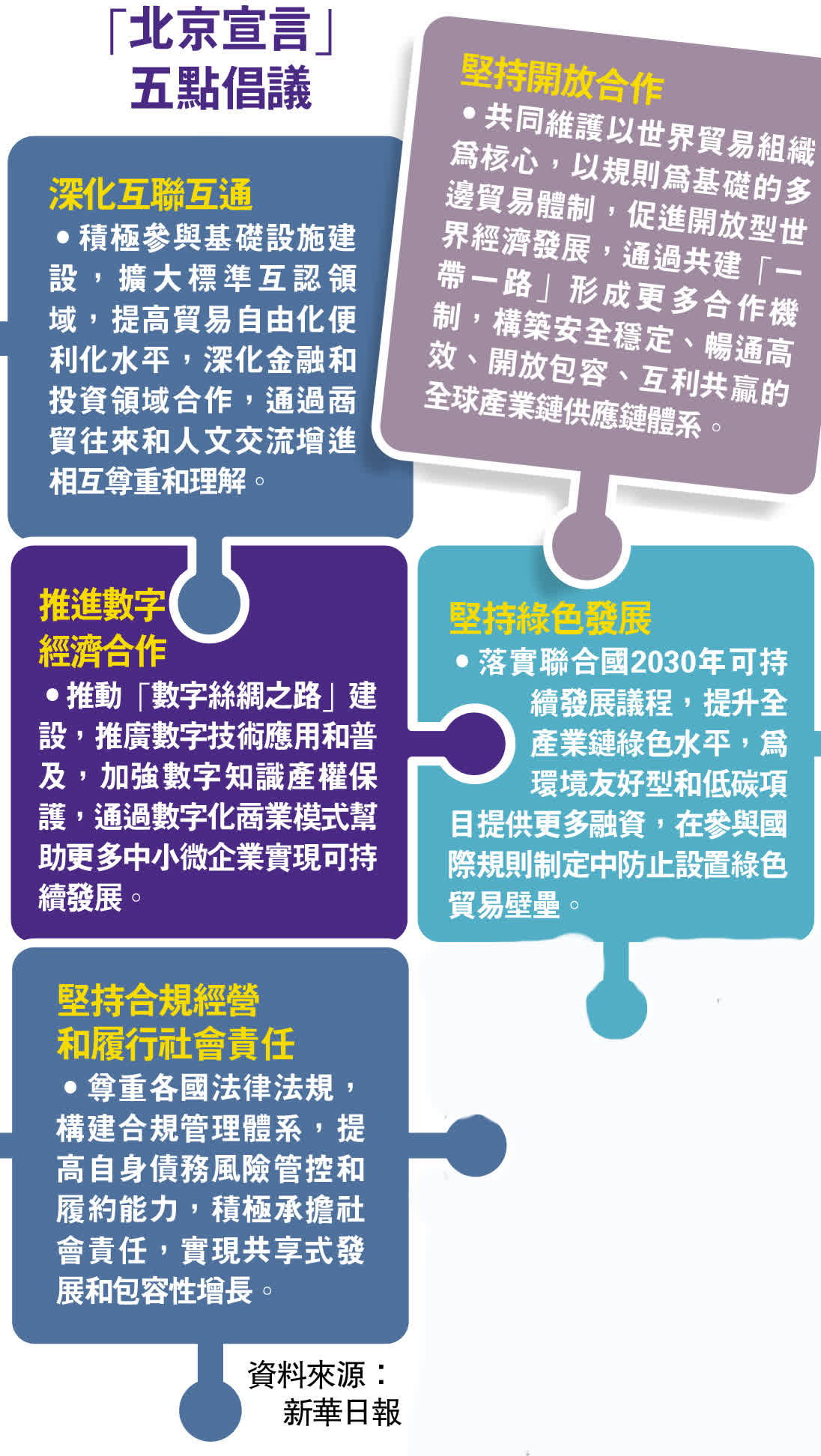 本屆峰會則採取了「3+6」的新模式,包括互聯互通、綠色發展、數字經濟3場高級別論壇,以及貿易暢通、民心相通、智庫交流、廉潔絲路、地方合作、海洋合作等6場專題論壇。這種層次分明的安排,契合了全球經濟、產業、科技發展大勢,對深化合作的指引性也更為明晰。
