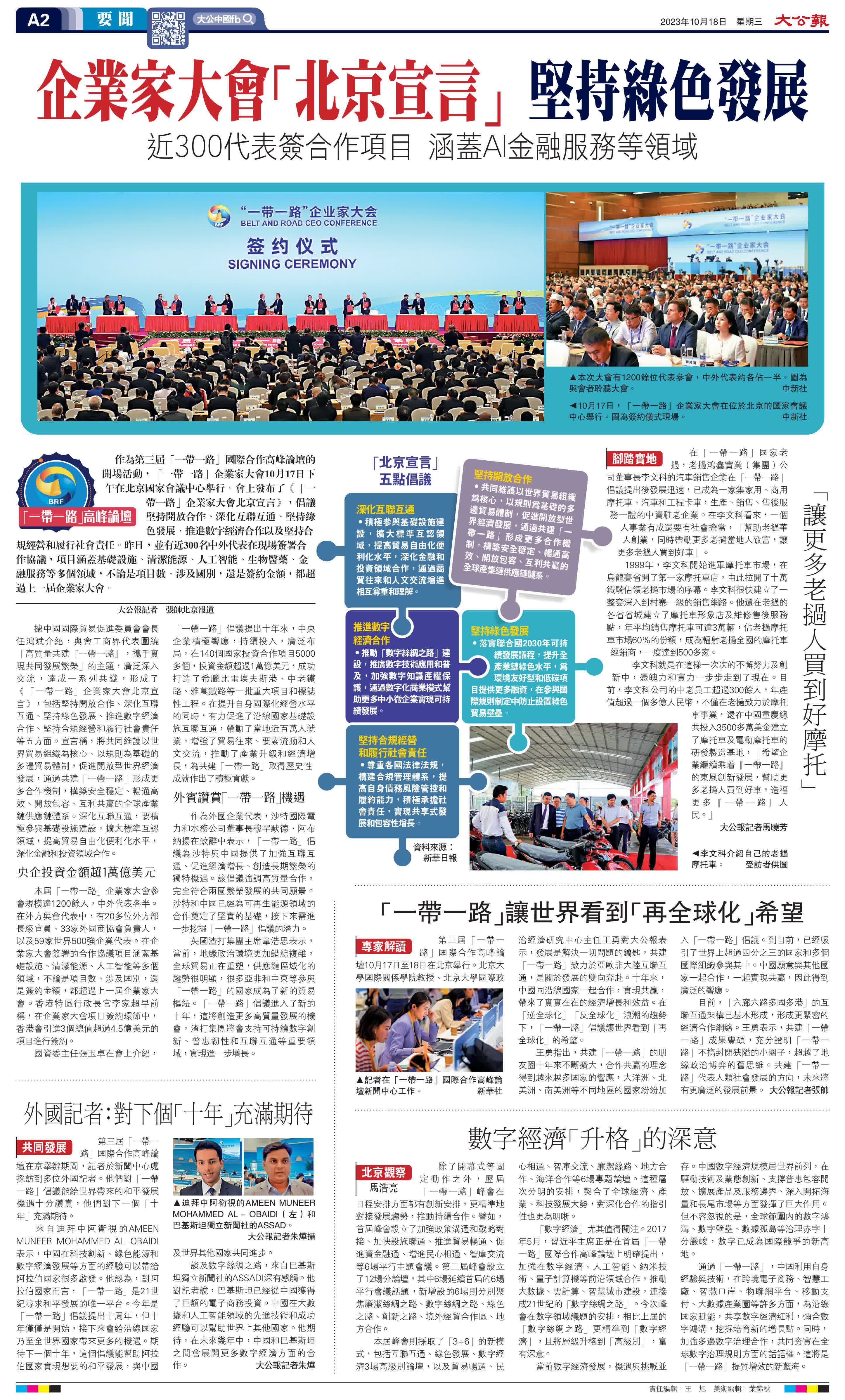 (大公報 記者 張帥、馬曉芳、朱燁)作為第三屆「一帶一路」國際合作高峰論壇的開場活動,「一帶一路」企業家大會10月17日下午在北京國家會議中心舉行。會上發布了《「一帶一路」企業家大會北京宣言》,倡議堅持開放合作、深化互聯互通、堅持綠色發展、推進數字經濟合作以及堅持合規經營和履行社會責任。昨日,並有近300名中外代表在現場簽署合作協議,項目涵蓋基礎設施、清潔能源、人工智能、生物醫藥、金融服務等多個領域,不論是項目數、涉及國別,還是簽約金額,都超過上一屆企業家大會。
