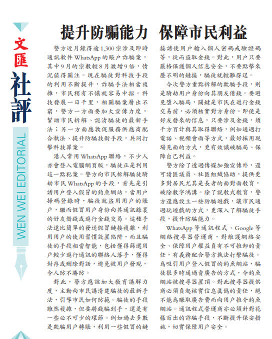 警方近月錄得逾1,300宗涉及即時通訊軟件WhatsApp的賬戶詐騙案,其中9月的宗數較8月激增9倍,情況值得關注。現在騙徒對科技手段的利用不斷提升,詐騙手法相當複雜,市民稍有不慎就容易中招。科技發展一日千里,相關騙案層出不窮,警方一方面要加大宣傳力度,幫助市民拆解、認清騙徒的最新手法;另一方面應敦促服務供應商配合執法、提升防騙技術手段,共同打擊科技罪案。