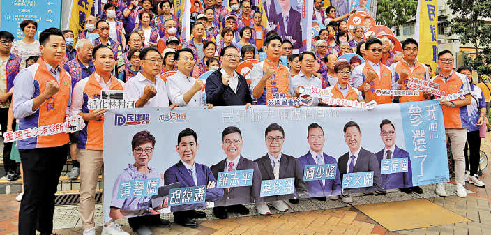 民建聯另有七名成員昨日在大埔區報名參選,其中地區委員會界別選舉參選人包括羅志平、李文傑、黃偉憧、梅少峰、葉俊傑,黃碧嬌及胡綽謙分別參選大埔南及大埔北。