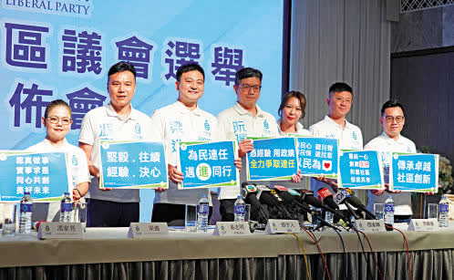 區議會選舉提名期展開,自由黨將派出7人參選,其中4人參選地區直選,包括將參選中西區中區選區的馮家亮、灣仔區灣仔選區的宋芝齡、東區太北選區的阮建中、南區東南選區的梁進;另有3人參與「三會」間選,包括將參選深水埗區的陳建業、灣仔區林偉文及東區曾卓兒。在參選的7人當中,3人為現任區議員,1人為首次參選。