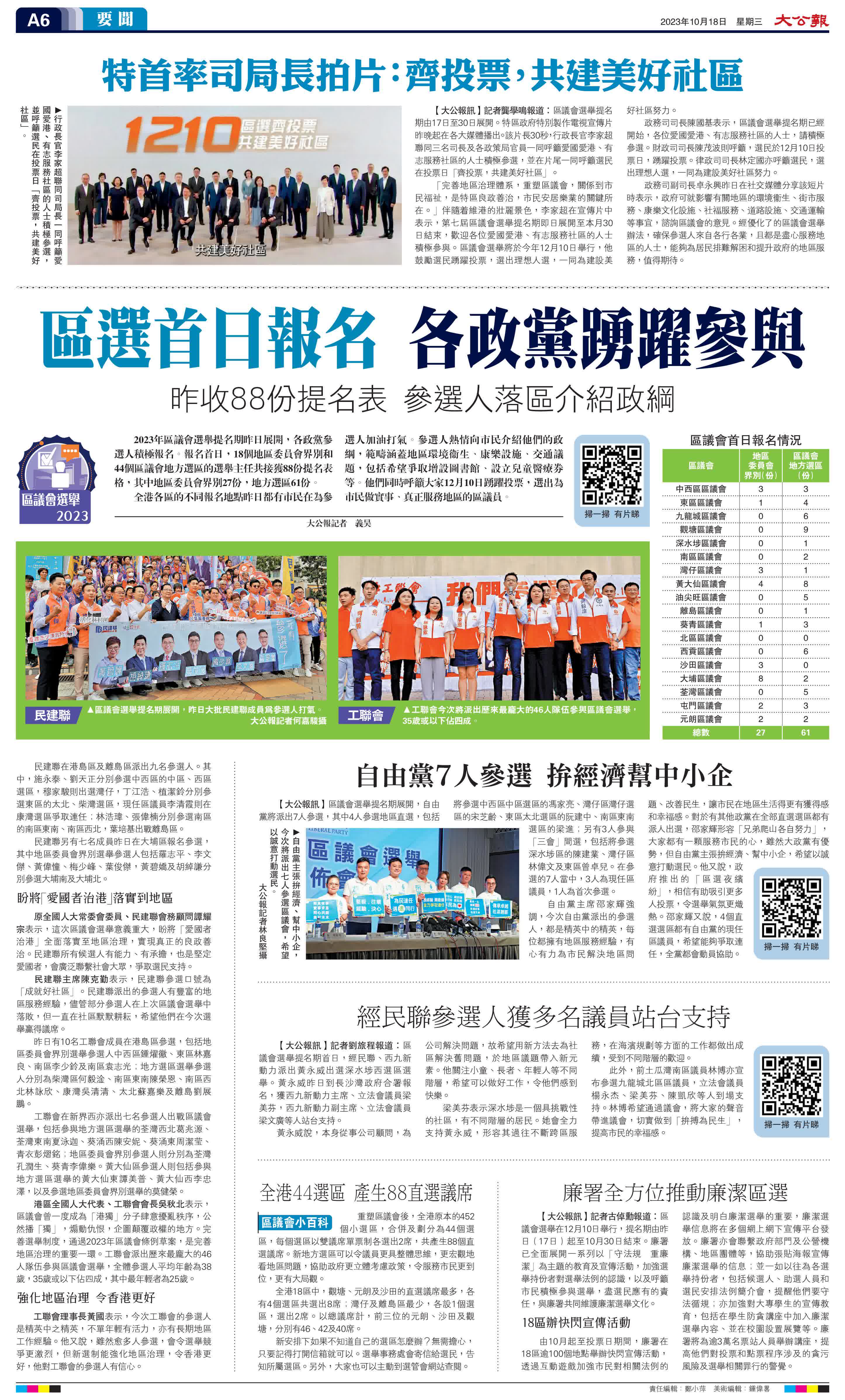 (大公報 記者 義昊、劉旅程、古倬勳)2023年區議會選舉提名期昨日展開,各政黨參選人積極報名。報名首日,18個地區委員會界別和44個區議會地方選區的選舉主任共接獲88份提名表格,其中地區委員會界別27份,地方選區61份。
