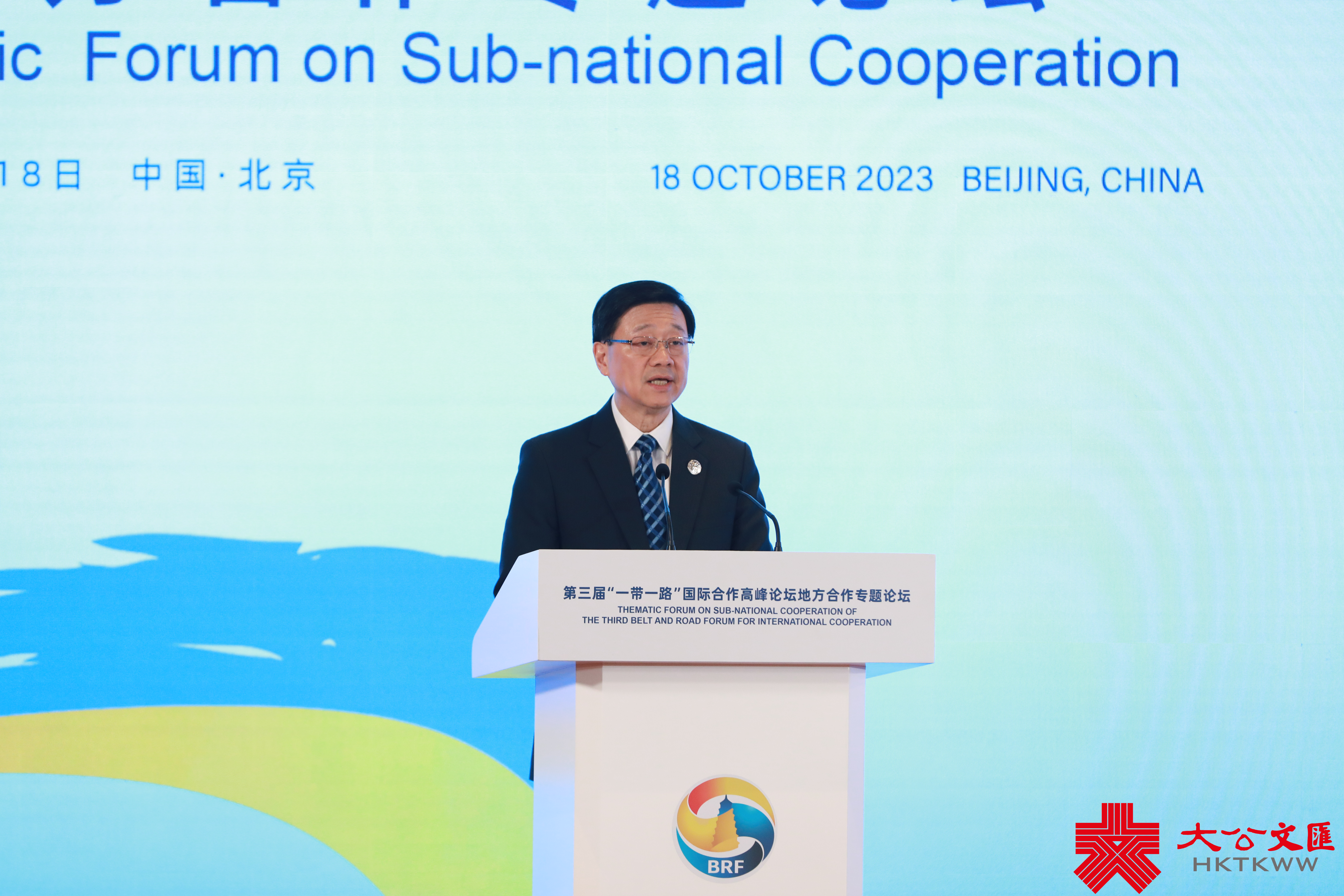 (大公文匯網記者 馬靜 北京報道)今日(18日)在北京舉行的第三屆「一帶一路」國際合作高峰論壇地方合作專題論壇特設「香港專場」。行政長官李家超在致辭中表示,地方合作是共建「一帶一路」重要一環,期待與各方交流合作,推動區域間、城市間、人民間的聯通。