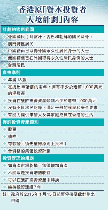 俗稱「投資移民」的資本投資者入境計劃,自2003年起實施,最初投資門檻為650萬元,到2010年提升至1,000萬元,同時將買樓剔出該計劃的資產類別選項,但有關計劃最終在2015年停辦。為促進本港經濟長遠發展,有關計劃在停辦8年後重啟。政府指出,新計劃的投資額預期會較舊有要求的1,000萬元倍增,即新計劃投資門檻至少達2,000萬元。此外,投資項目中亦不包括物業投資,投資者亦不包括內地人士。而投資資產除金融資產外,也會考慮如初創、創科等有利香港長遠發展的行業。據了解,有關資產類別還可考慮金融科技、生命科技等方面的投資。