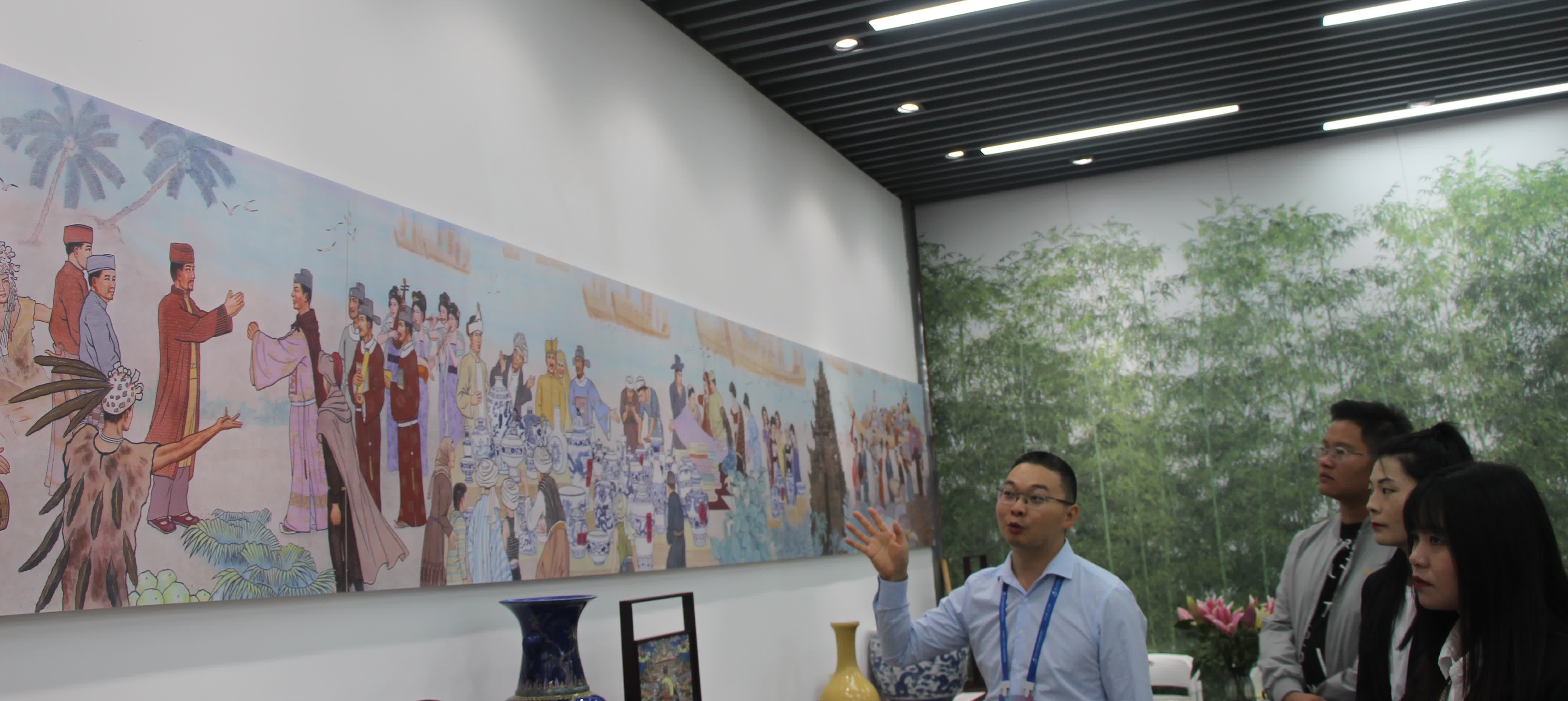 在2023中國景德鎮國際陶瓷博覽會展覽中,有一幅長長的瓷板畫吸引不少觀眾駐足欣賞,這幅主題為《碧海青花》、《絲路瓷魂》的瓷板畫,曾為獻禮「一帶一路」第二屆國際合作高峰論壇而創作,講述了古代(海、陸)絲綢之路的輝煌歷史景象,將歷史鮮活的呈現於世人眼前,寓意千年瓷都景德鎮,繼往開來,開拓創新,必將在中華民族現代文明建設中再鑄輝煌。