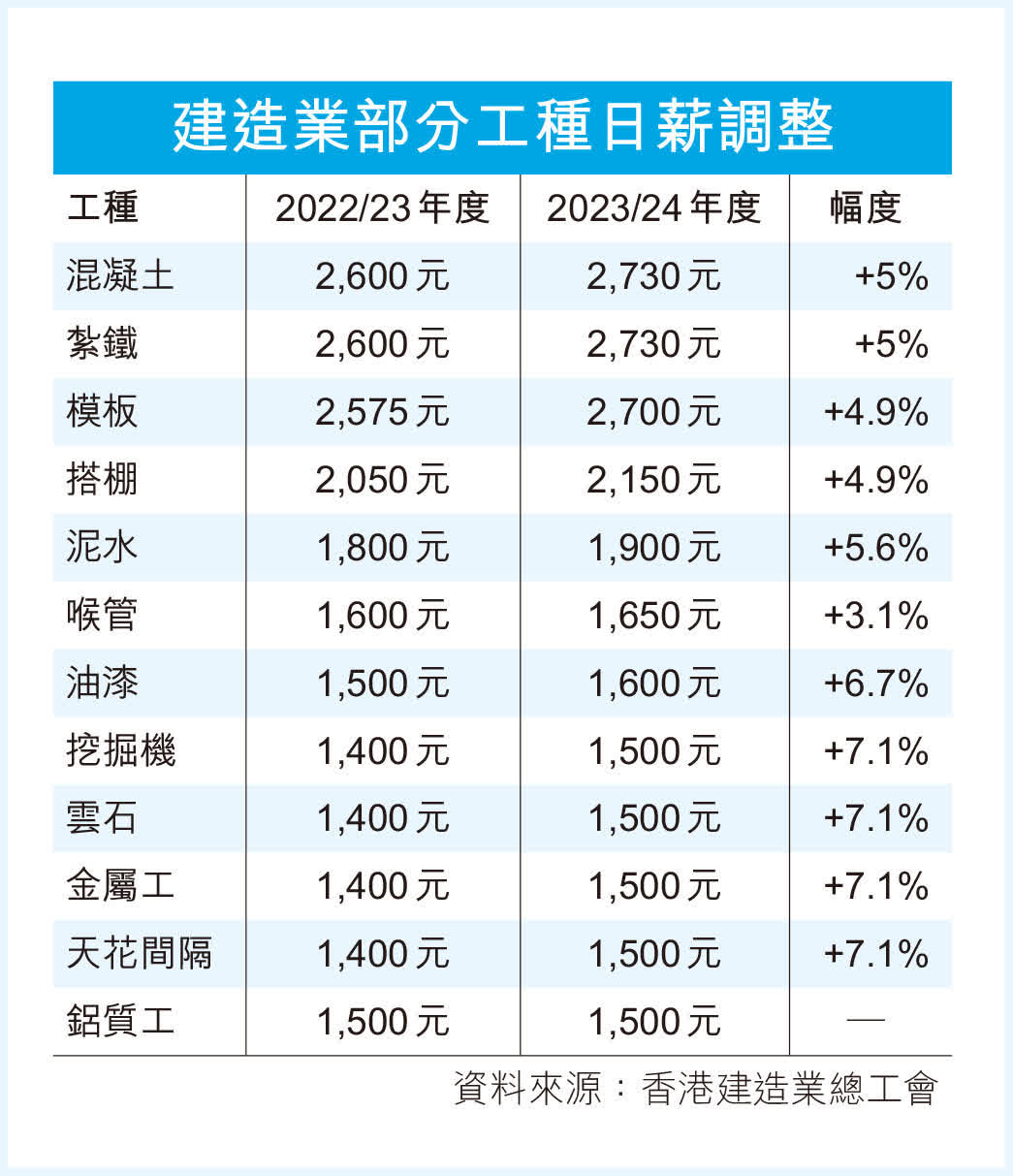 香港建造業總工會昨日公布本年度(2023/24年度)薪酬調整幅度,15項主要工種下月1日起加薪3.1%至7.1%,日薪調整至1,500至2,730元。