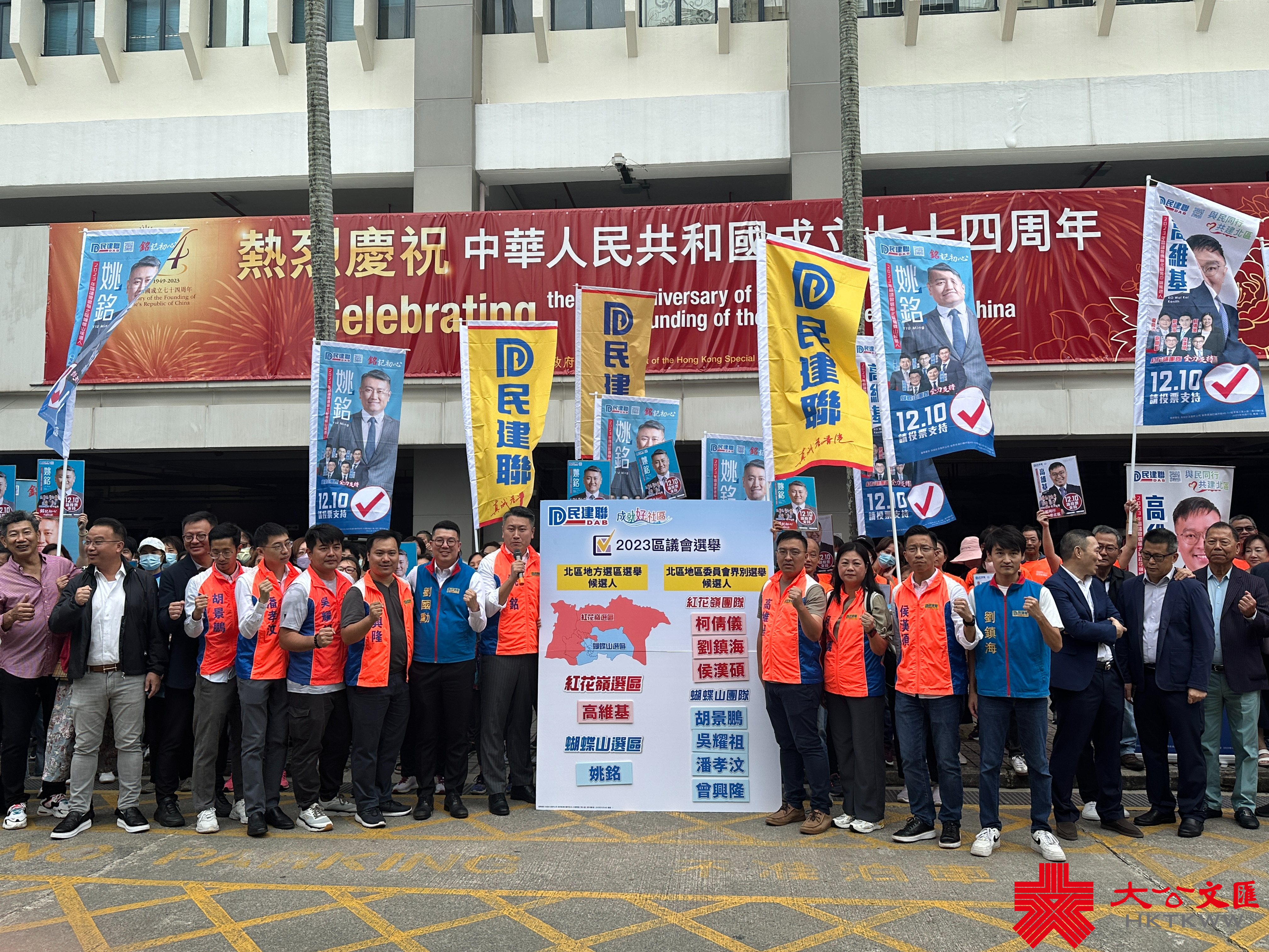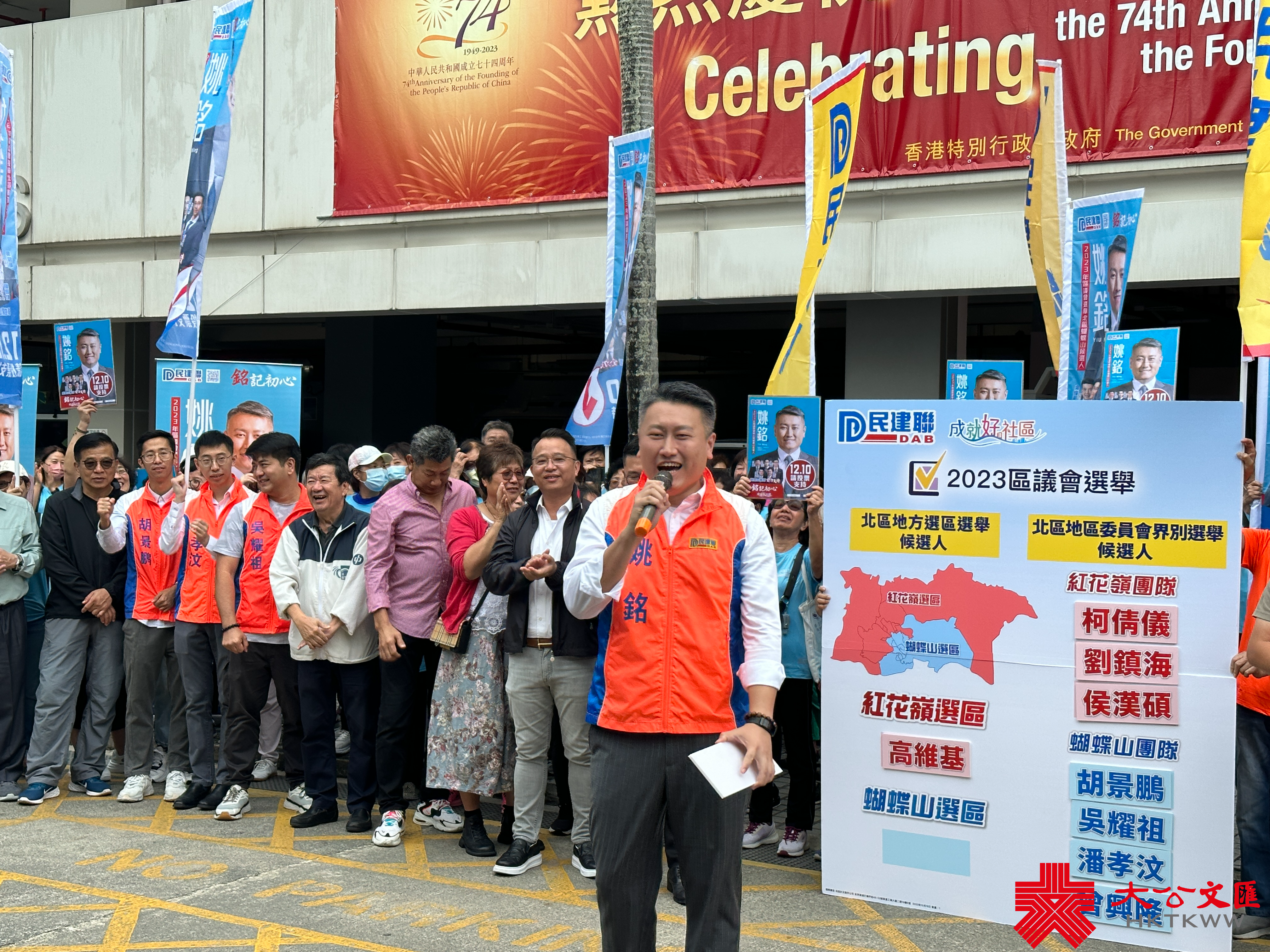 (大公文匯全媒體 記者 方正)2023年區議會一般選舉將於12月10日(星期日)舉行,提名期從10月17日開始至10月30日結束。民建聯北區支部主席姚銘及北區區議員高維基,今日(20日)分別報名參加2023北區區議會蝴蝶山及紅花嶺選區選舉,並在一眾支持者見證下在粉嶺北區政府合署發表參選宣言。