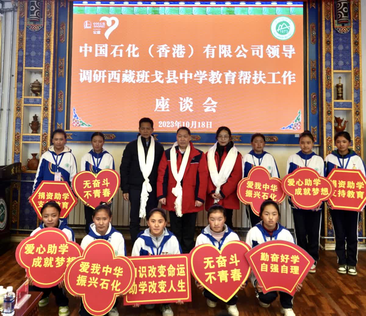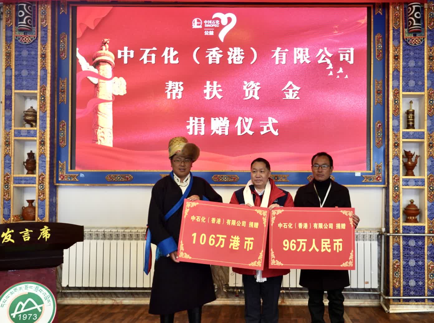 中石化(香港)有限公司副總經理鄒偉海,總經理助理、綜合管理部總經理譚明,綜合管理部副總經理白金出席是次捐贈儀式。在班戈縣委副書記孔祥飛,縣委副書記、市委副秘書長李召雪,副縣長旦增桑布,教育局副局長其格見證下,班戈縣中學校長尼瑪頓珠及相關負責人、教師和學生代表接受捐贈。是次資助是中石化香港落實國家精準扶貧、公益助學重要措施,資金將用於獎學金、獎教金和教育設施設備購置金。獎學金旨在嘉許學業成績優異者,激勵學生勤奮學習;獎教金目的是激勵教師持續進修,提升教學水平;教育設施設備購置金將用於改善校舍硬件及設施配套,將最新信息科技技術融入校舍,為學生締造良好學習環境。