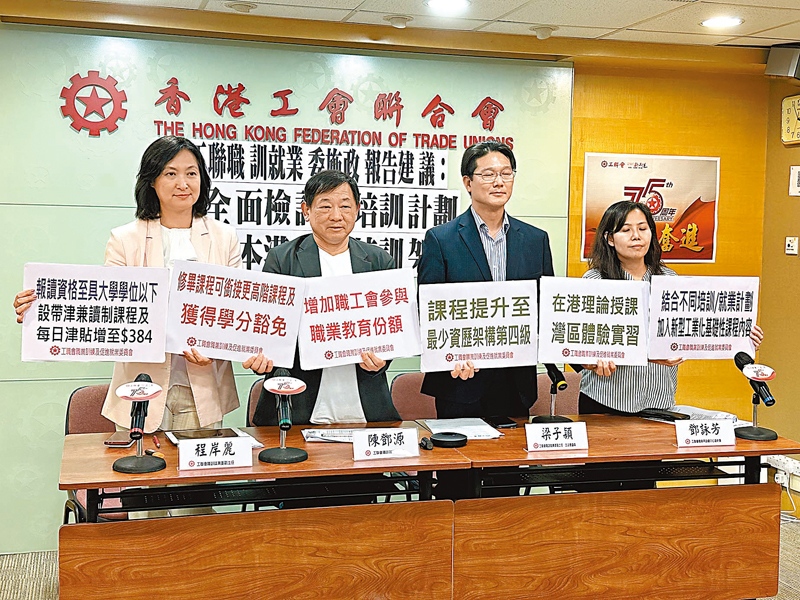 另外,工聯會職業訓練及促進就業委員會昨日就施政報告的職業教育提出建議,認為香港正面對本地勞動力不足難題,要推動高質量經濟發展升級及轉型,整體人力資源規劃需要配合國家發展及香港的定位,包括現行的職業教育規劃,讓社會及產業發展時與職業教育接軌,長遠亦應訂立人才需求時間表,以適時培訓專才。在再培訓計劃的課程方面,現時報讀資格限制在副學位或以下人士,委員會建議應放寬供較高學歷者亦能報讀,並增加每日津貼,及涵蓋至兼讀制課程。