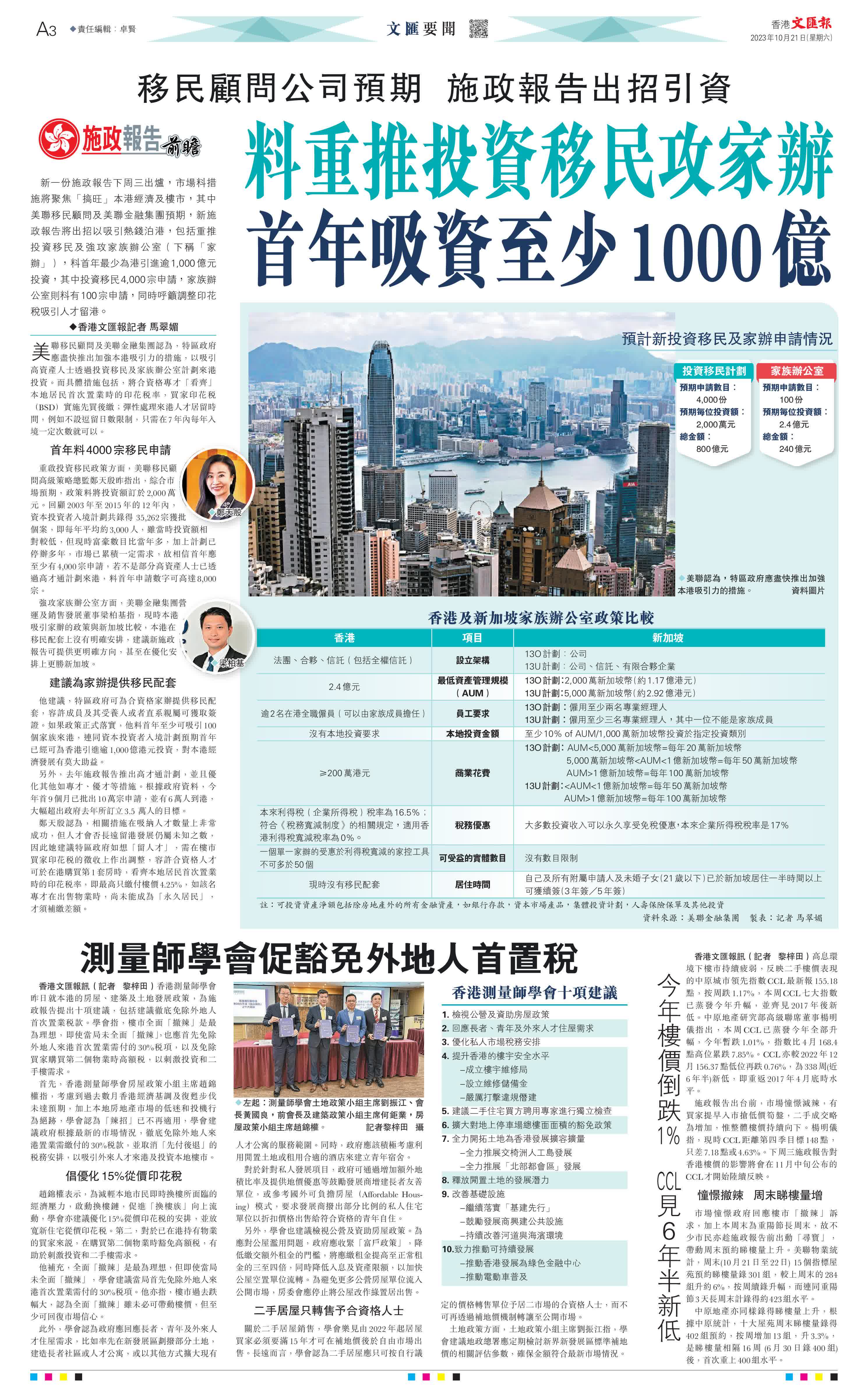 (香港文匯報記者 馬翠媚 黎梓田))新一份施政報告下周三出爐,市場料措施將聚焦「搞旺」本港經濟及樓市,其中美聯移民顧問及美聯金融集團預期,新施政報告將出招以吸引熱錢泊港,包括重推投資移民及強攻家族辦公室(下稱「家辦」),料首年最少為港引進逾1,000億元投資,其中投資移民4,000宗申請,家族辦公室則料有100宗申請,同時呼籲調整印花稅吸引人才留港。